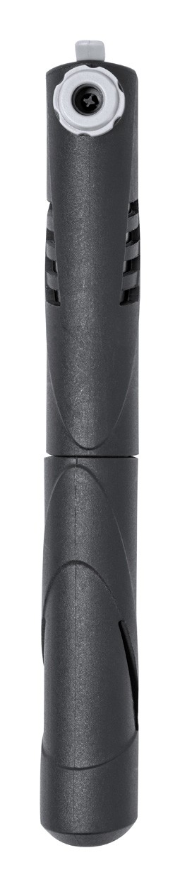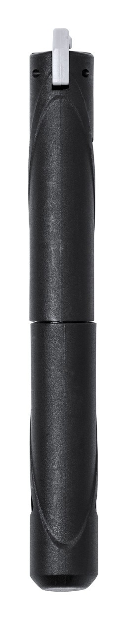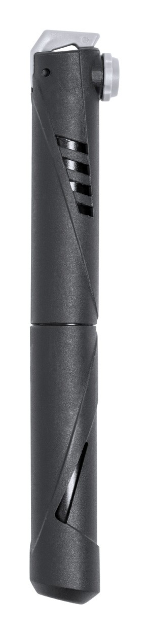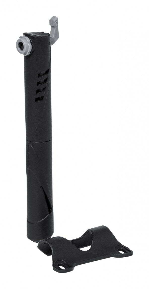 Mini pompă manuală pentru bicicletă, cu suport montat pe cadru.