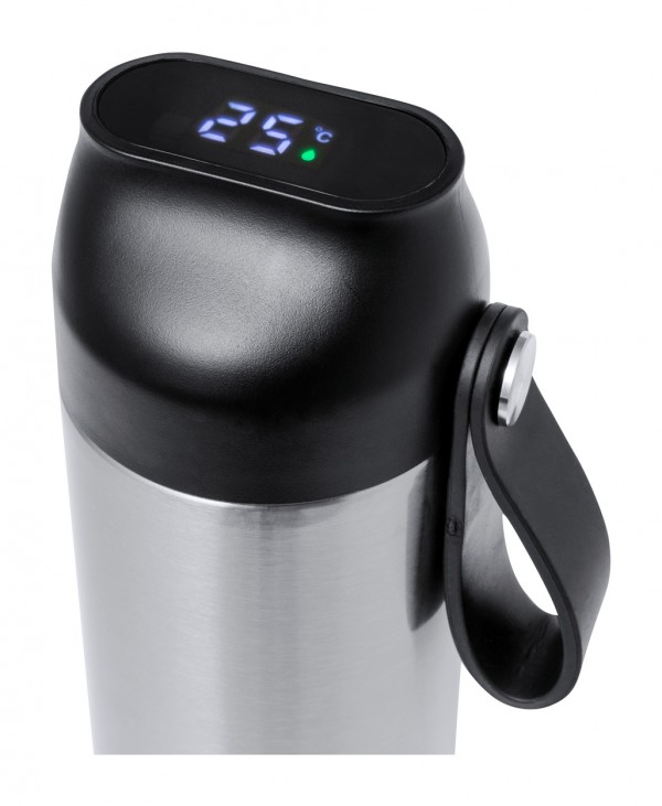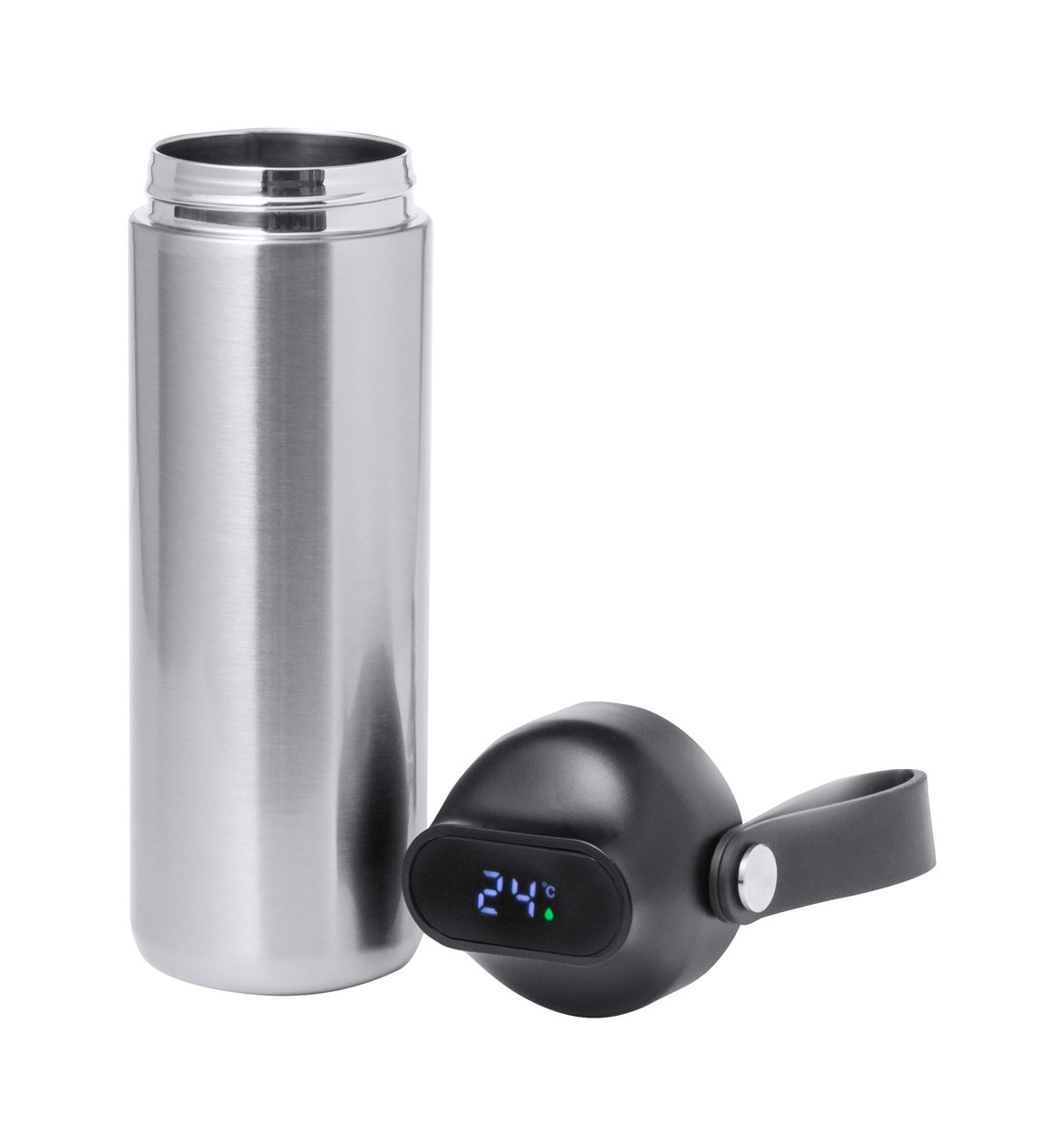 Termos cu perete dublu izolat, din oțel inoxidabil, cu termometru tactil LED pe capac. 630 ml. Izolația din cupru menține băuturile calde timp de 2 ore și reci timp de 4 ore.