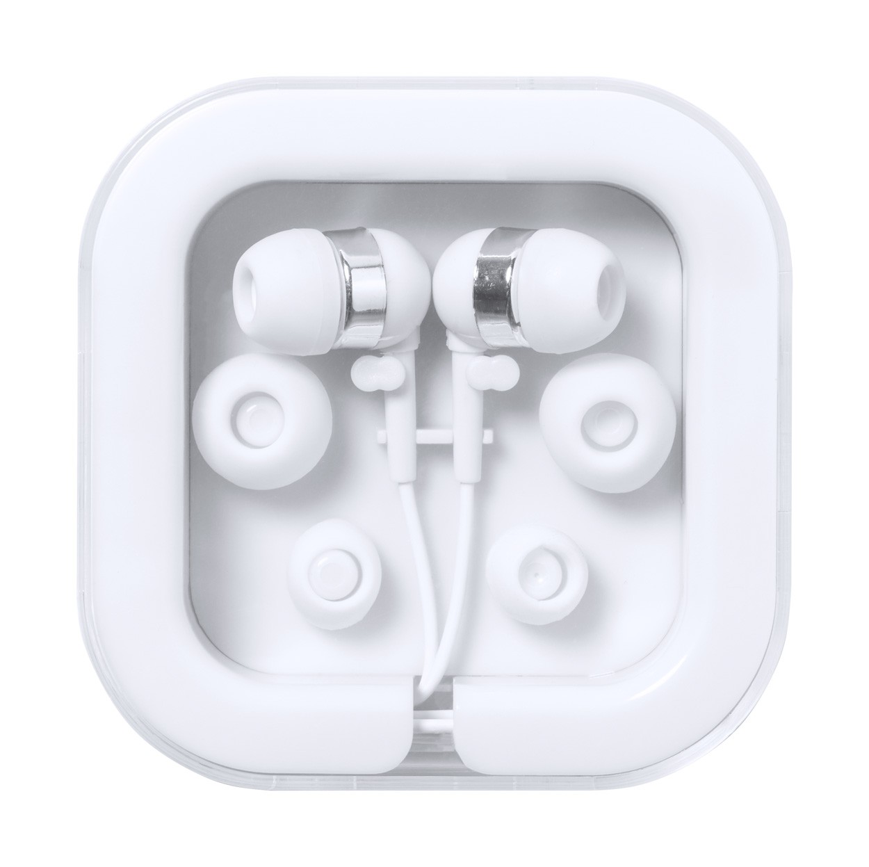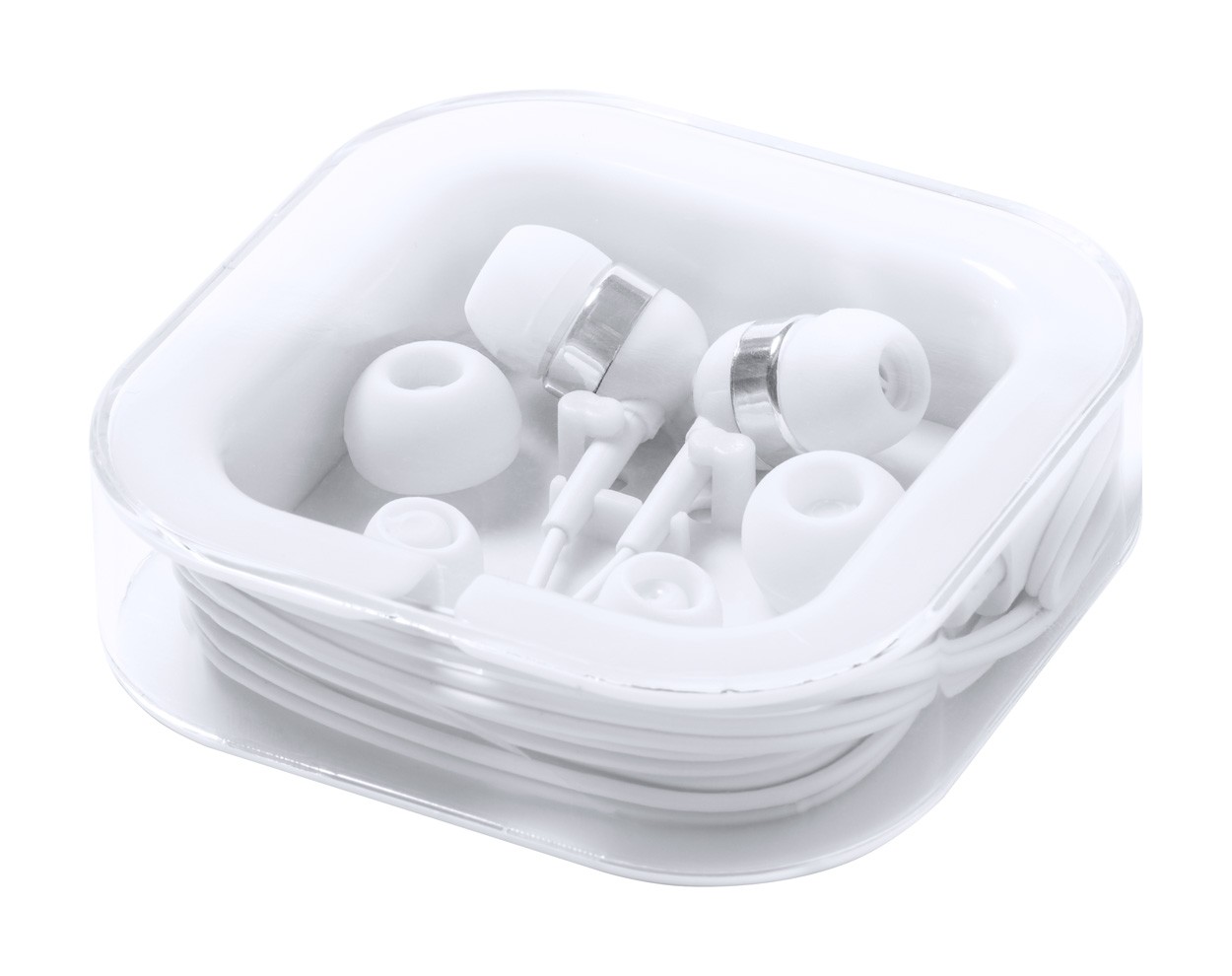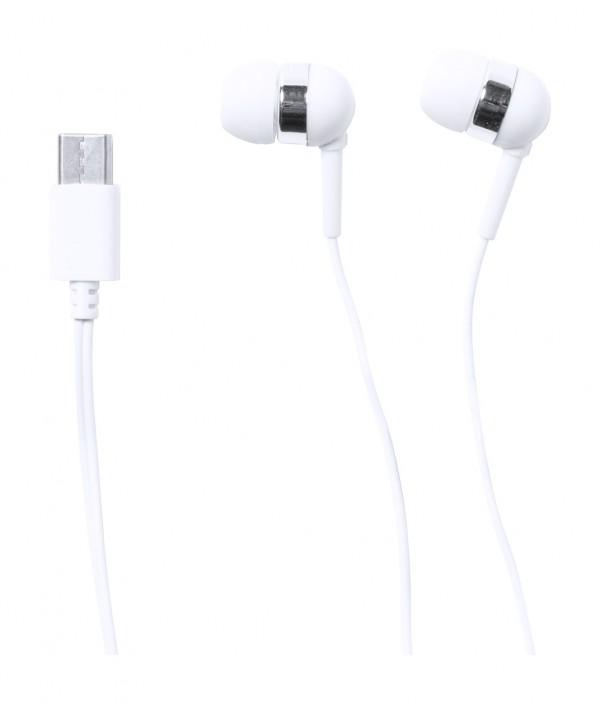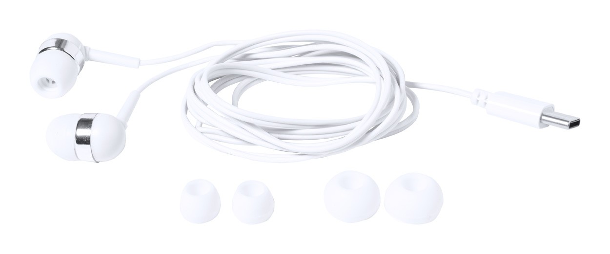 Căști intra-auriculare cu conexiune USB-C și 3 perechi de căști, în carcasă din plastic.