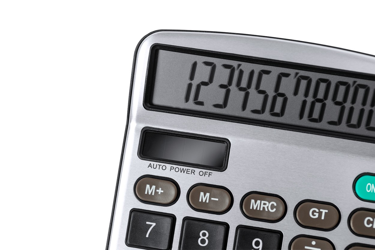 Calculator alimentat solar, cu 12 cifre din plastic ABS și carcasă din aluminiu. Inclusiv baterie tip buton.