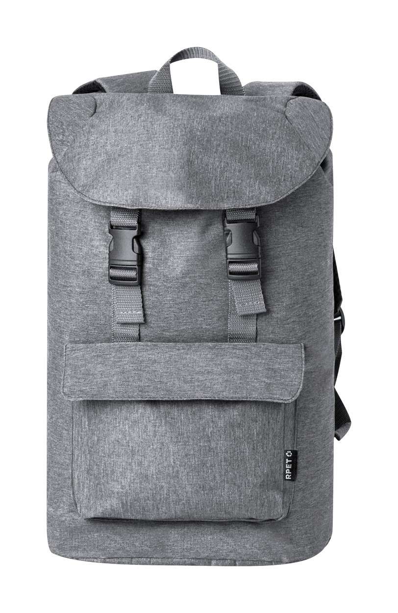 RPET backpack with padded laptop compartment, zipped front pocket, padded back and shoulder straps. Main compartment with drawstring and buckle closure. 600D RPET polyester. With distinctive RPET label.