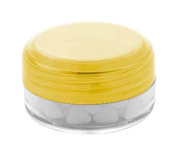 Recipient rotund cu bomboane de mentă, transparent, din plastic, cu capac cu filet, colorat. Conține cca. 12 grame de bomboane mentolate fără zahăr.