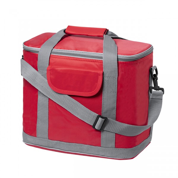 Geantă frigorifică cu fermoar din poliester 420D cu umplutură PEVA. Cu buzunar frontal cu velcro, mânere de transport și curea de umăr reglabilă.