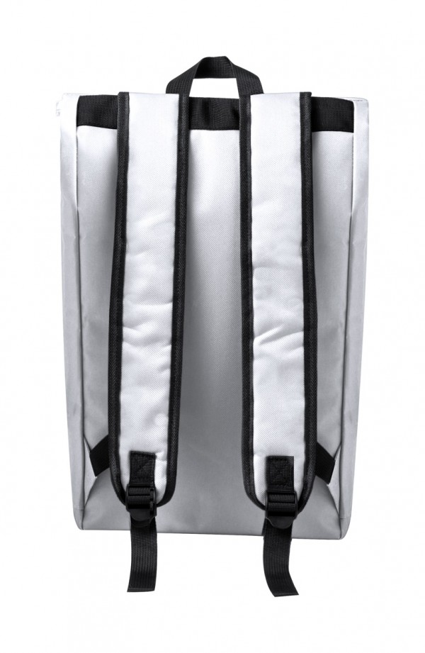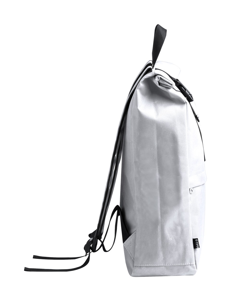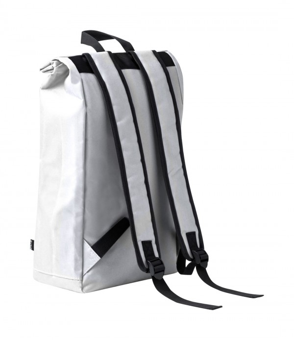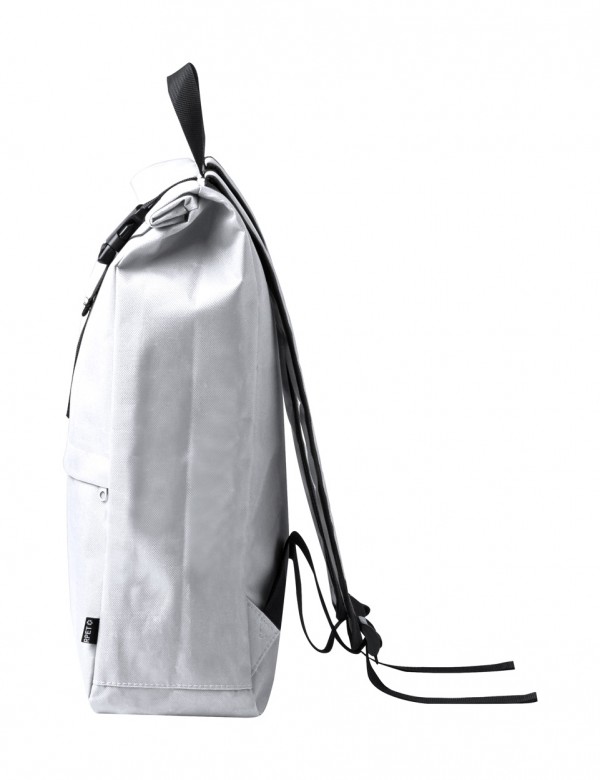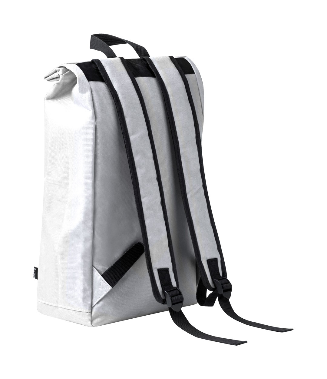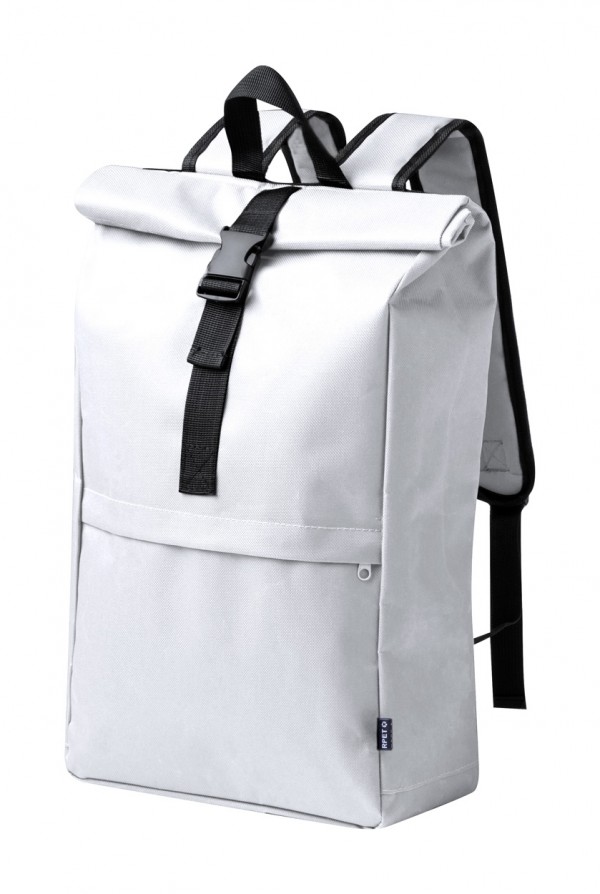 RPET rolltop backpack with buckle closure, zipped front pocket and compartments, padded back and shoulder straps. 600D RPET polyester with distinctive RPET label.