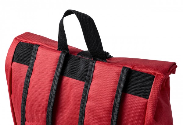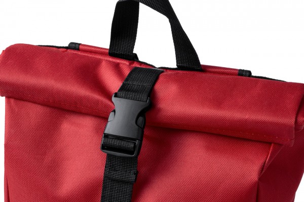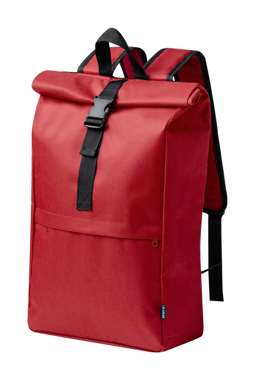 RPET rolltop backpack with buckle closure, zipped front pocket and compartments, padded back and shoulder straps. 600D RPET polyester with distinctive RPET label.