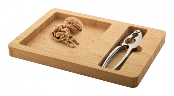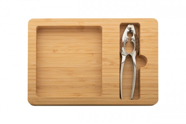 Set spărgător de nuci, cu tavă din bambus și clește metalic. În cutie de hârtie kraft.