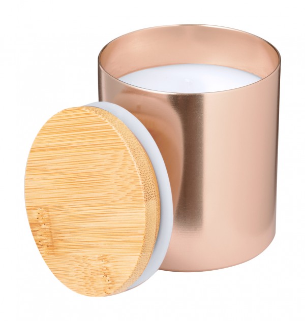Lumânare cu parfum de vanilie, în suport din aluminiu, cu capac din bambus.