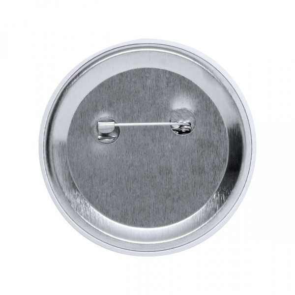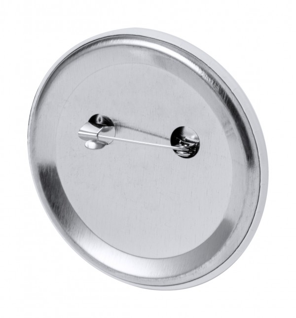 Metal pin badge with safety pin.
