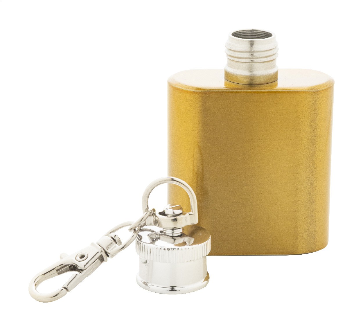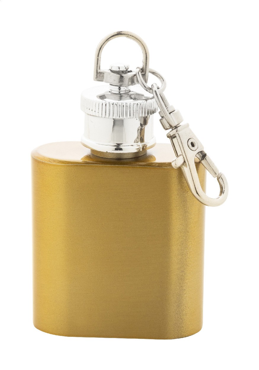 Mini-ploscă din oțel inoxidabil reciclat, cu finisaj metalic strălucitor și inel de chei cu carabină. 30 ml.