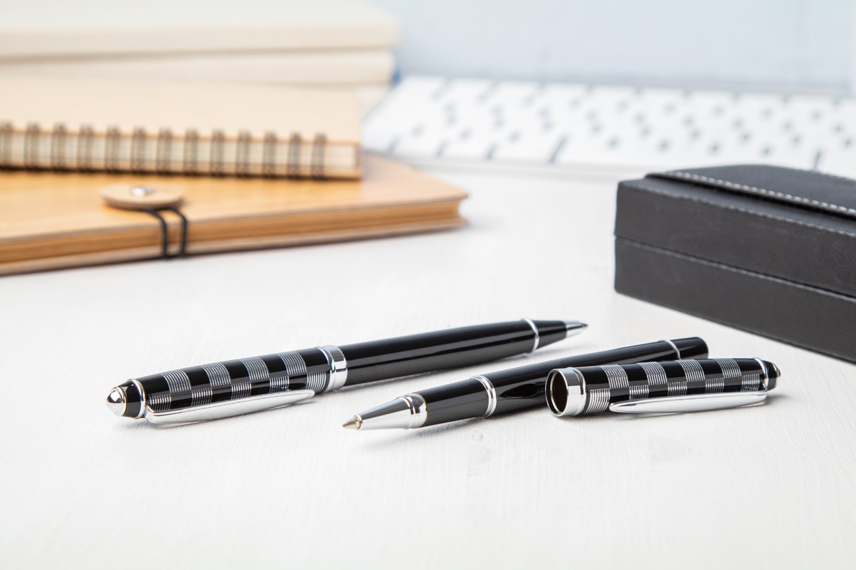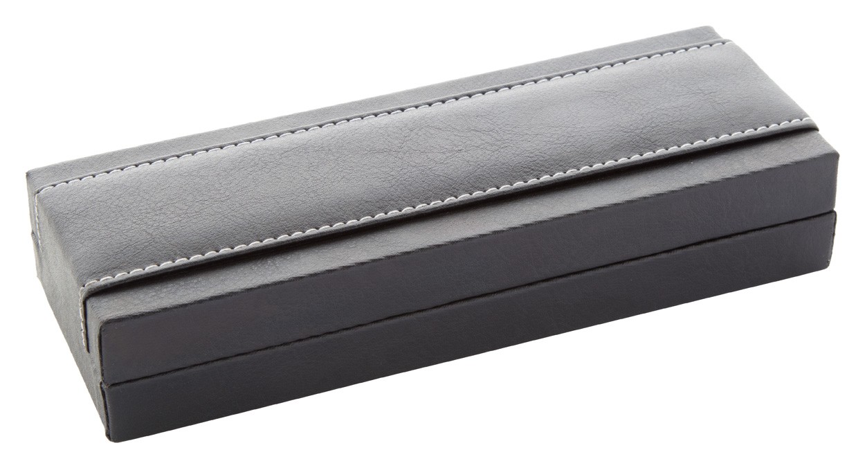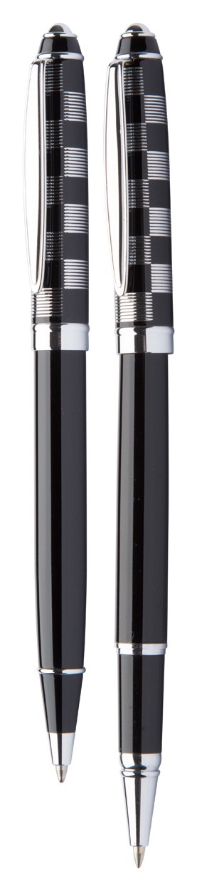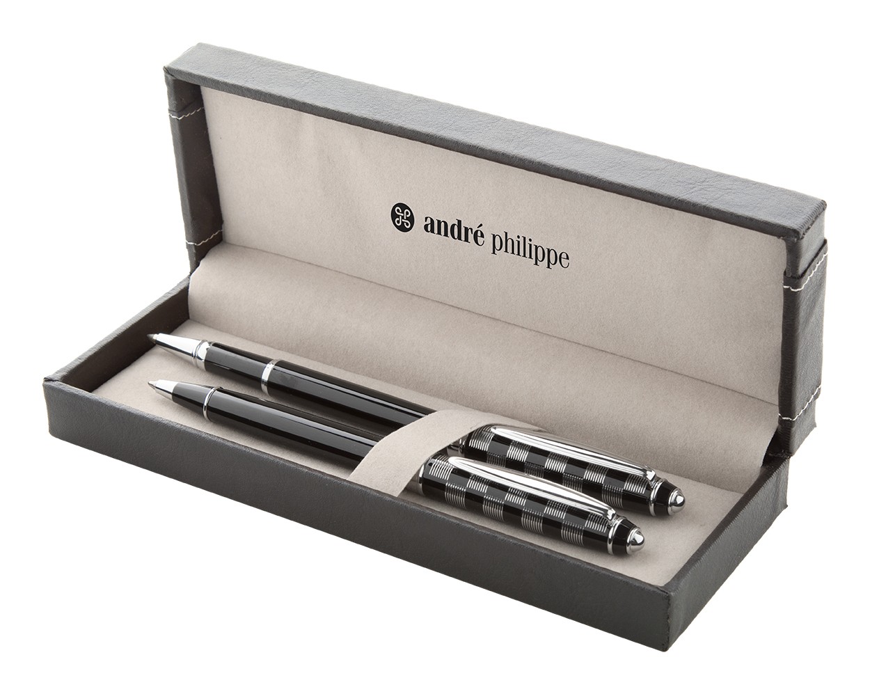 Pix și roller elegant, metalic, mină albastră. În cutie neagră de cadou din înlocuitor piele. Marca André Philippe.