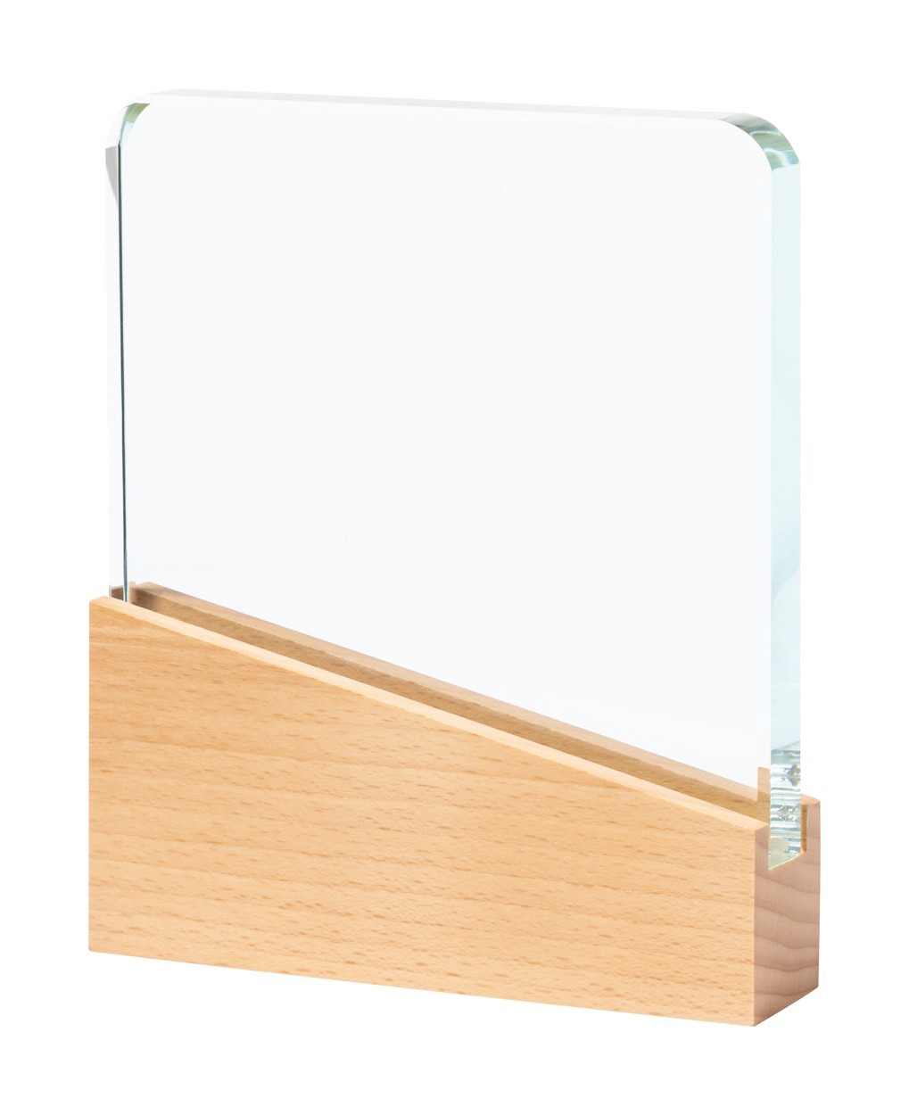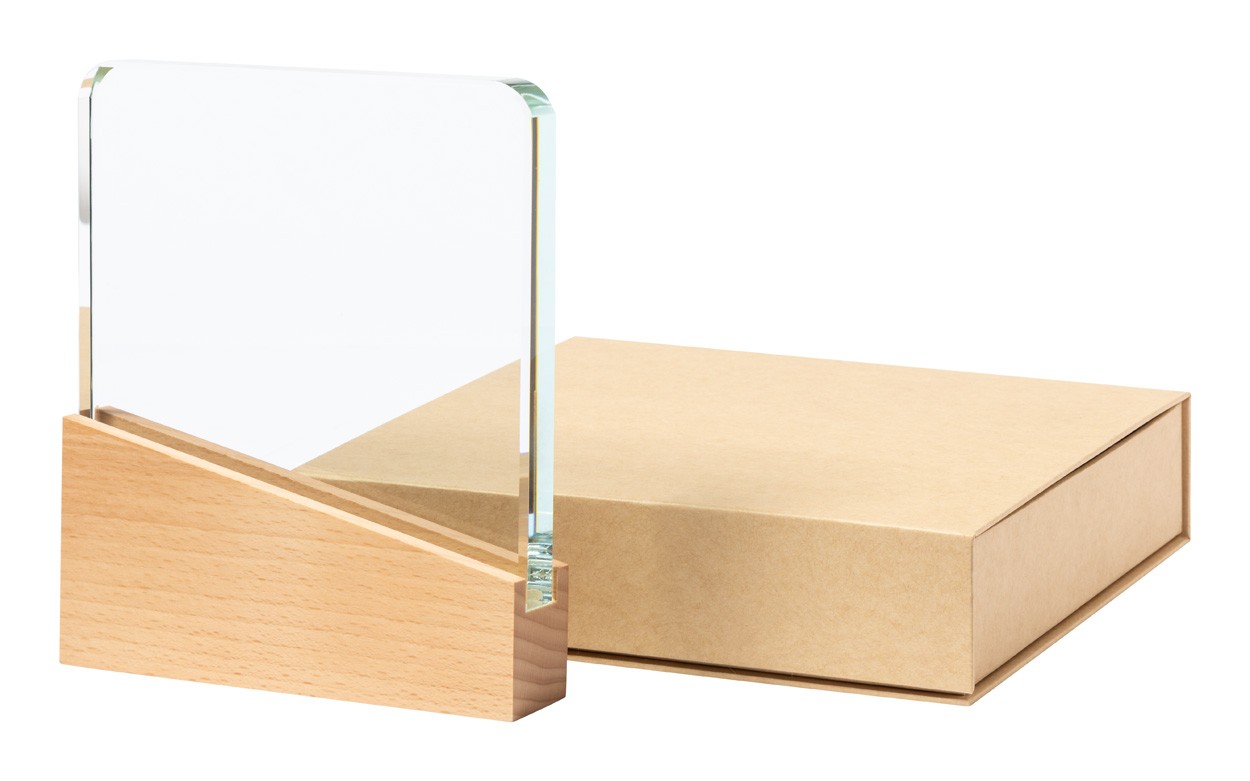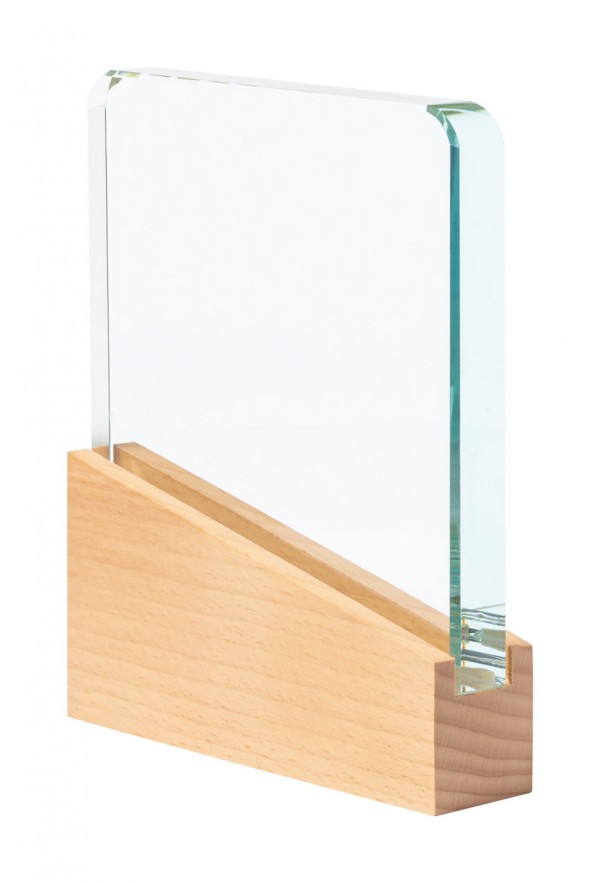 Trofeu din sticlă, cu baza din lemn. În cutie cadou din hârtie kraft.