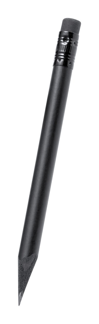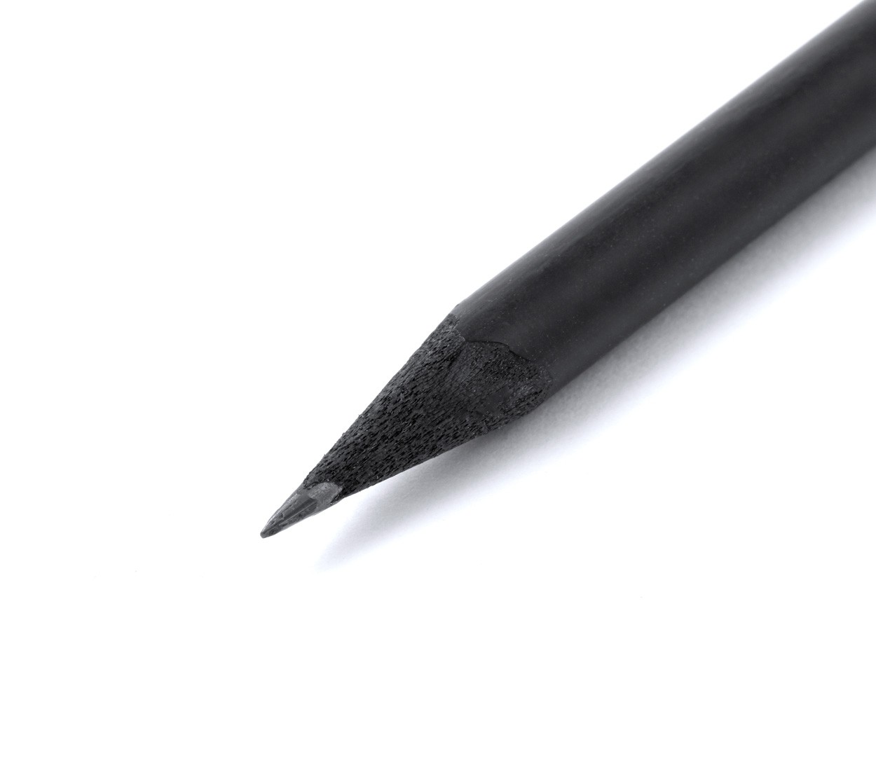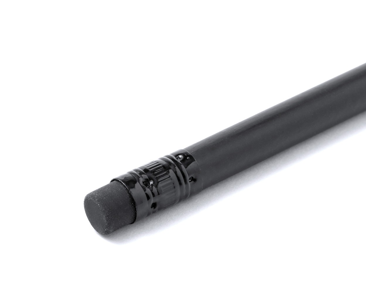 Wooden lead pencil with matte black finish and eraser, sharpened.