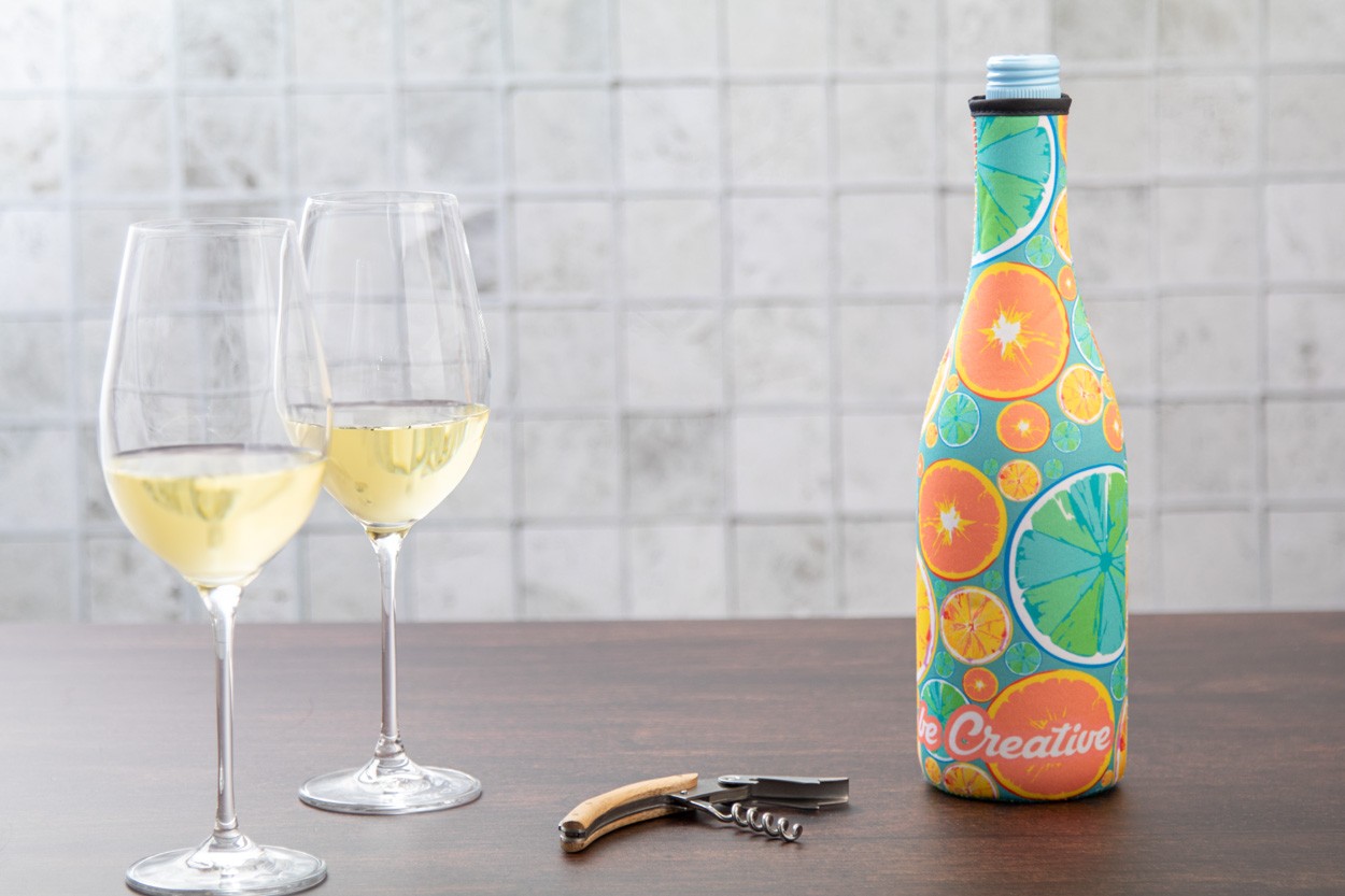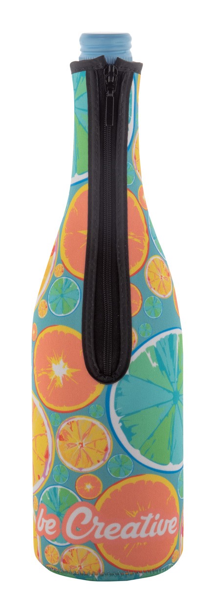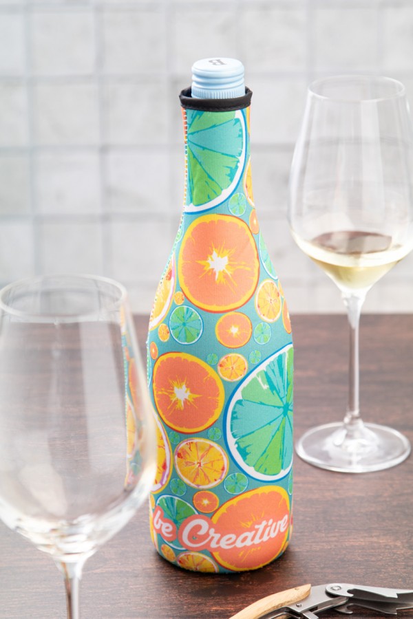 Husă termică, din neopren, realizată la comandă, cu fermoar, pentru sticlă de vin sau șampanie. Cu grafică imprimată prin sublimare. MOQ: 50 buc.