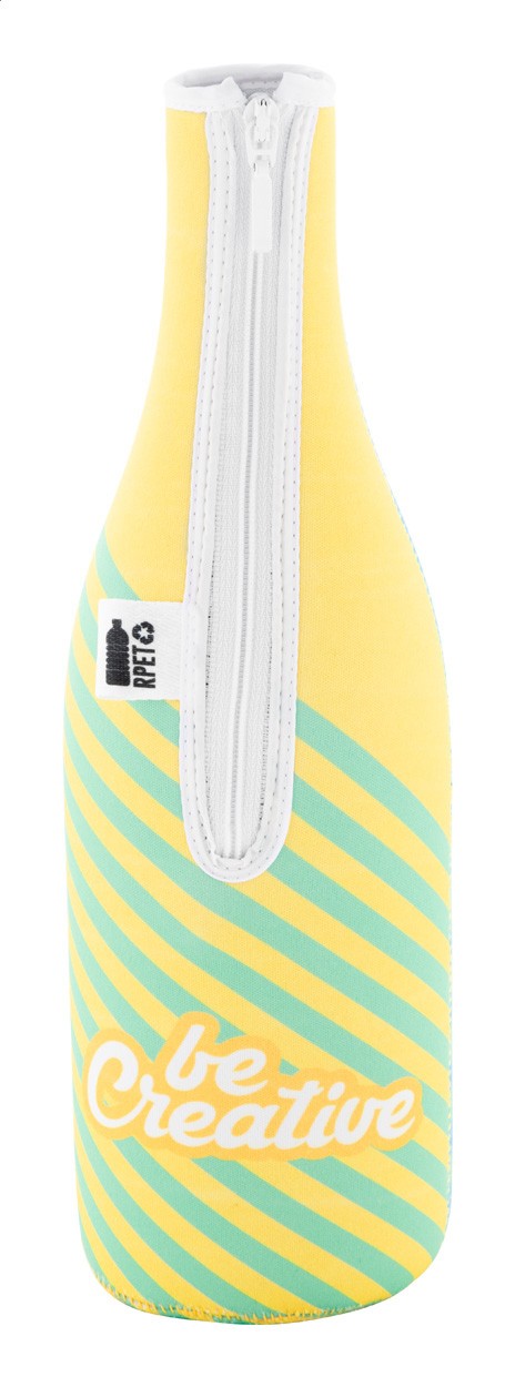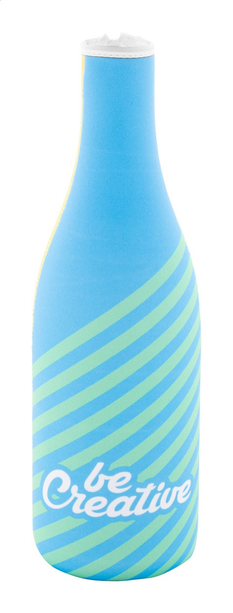 Husă frigorifică, din neopren RPET, realizată la comandă, cu fermoar, pentru sticlă de vin sau șampanie. Cu grafică imprimată prin sublimare. MOQ: 25 buc.