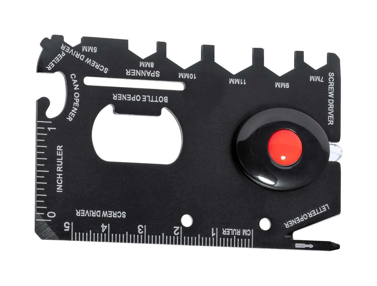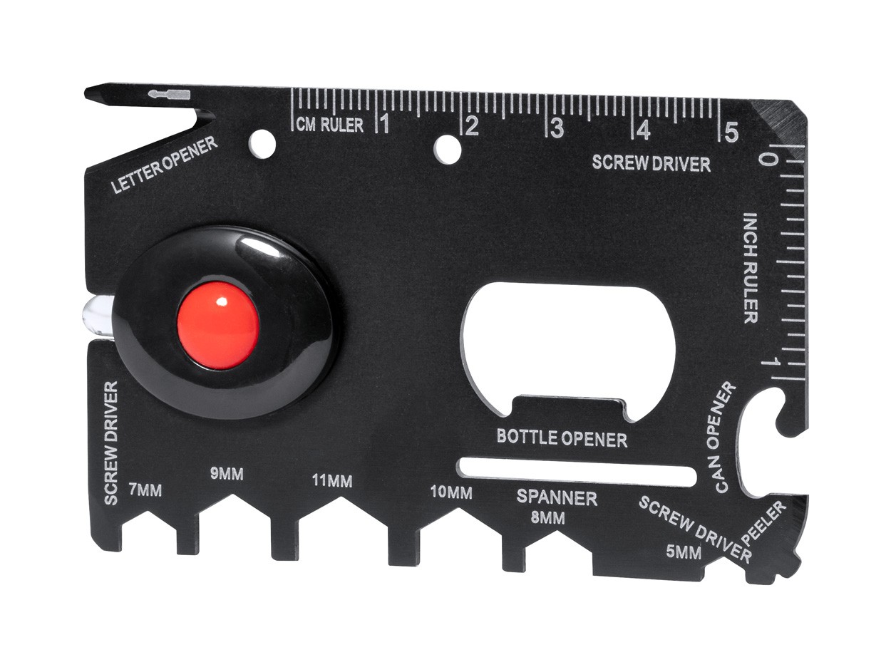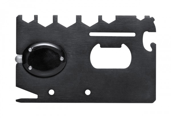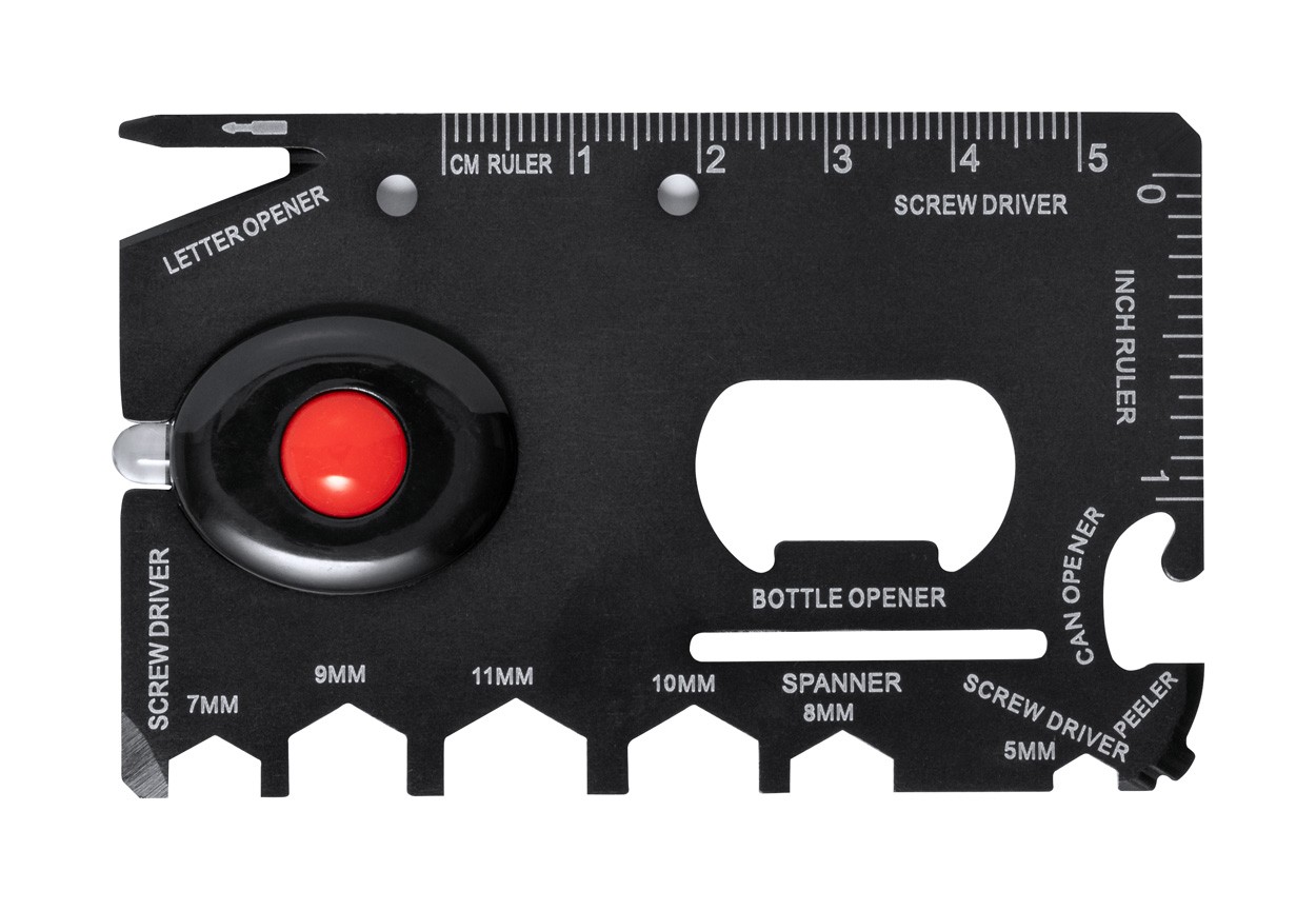 Instrument multifuncțional din oțel inoxidabil, în formă de card, cu 1 LED și 16 funcții. Inclusiv baterii tip buton.