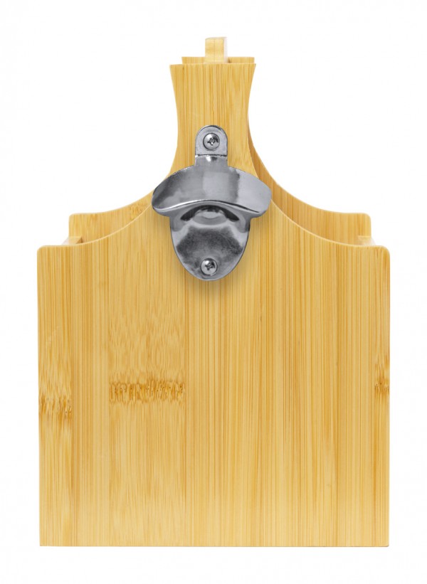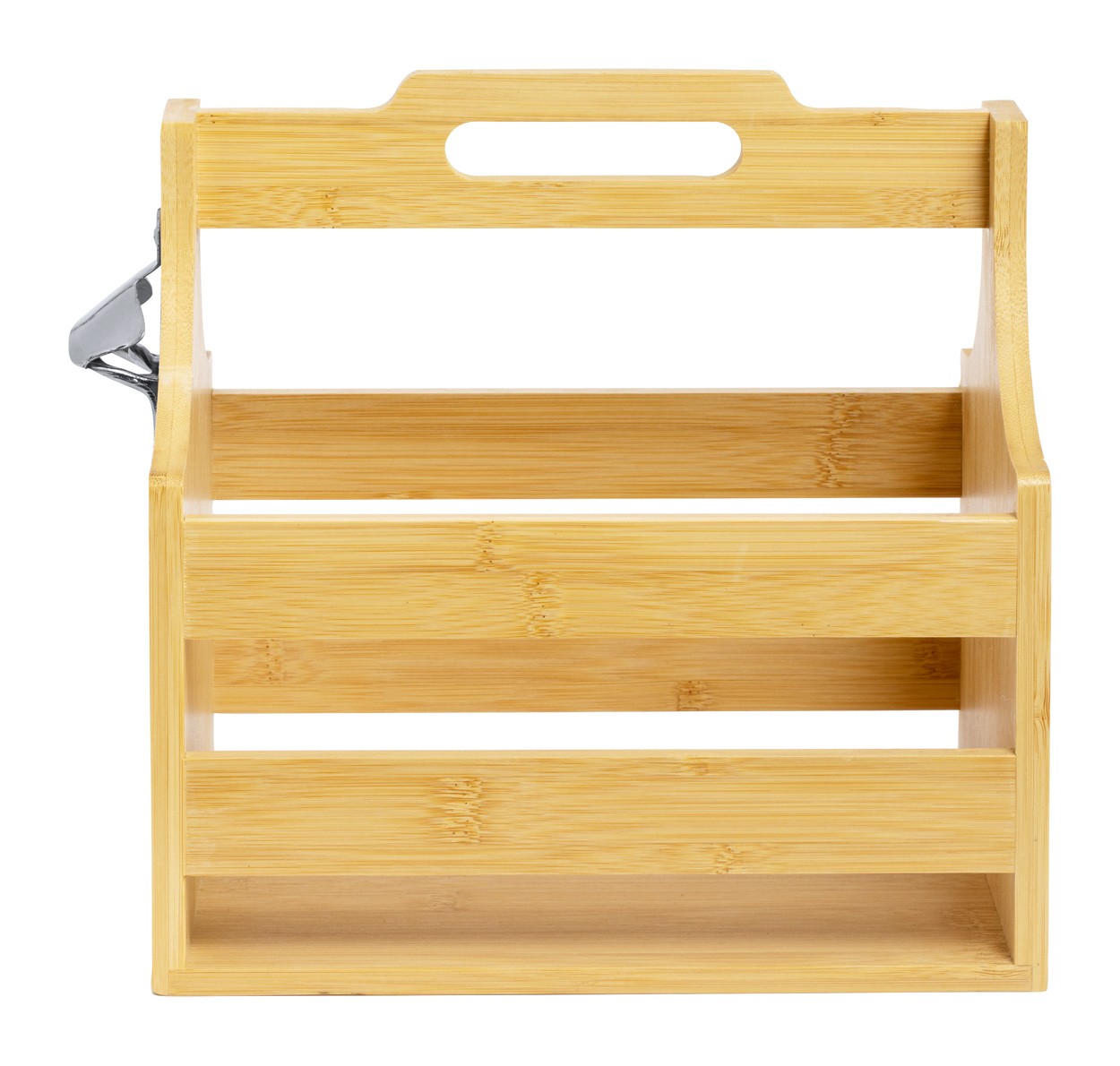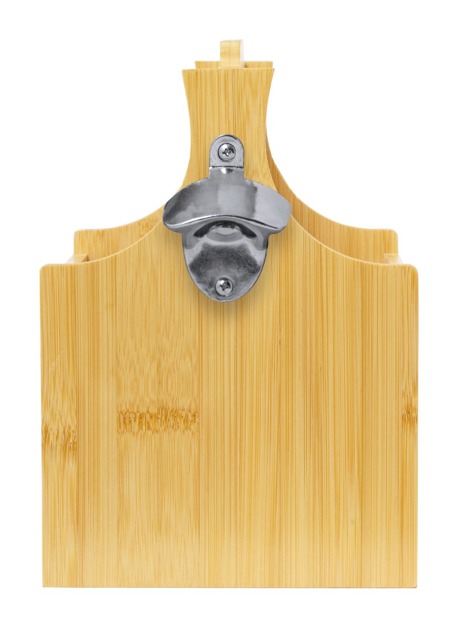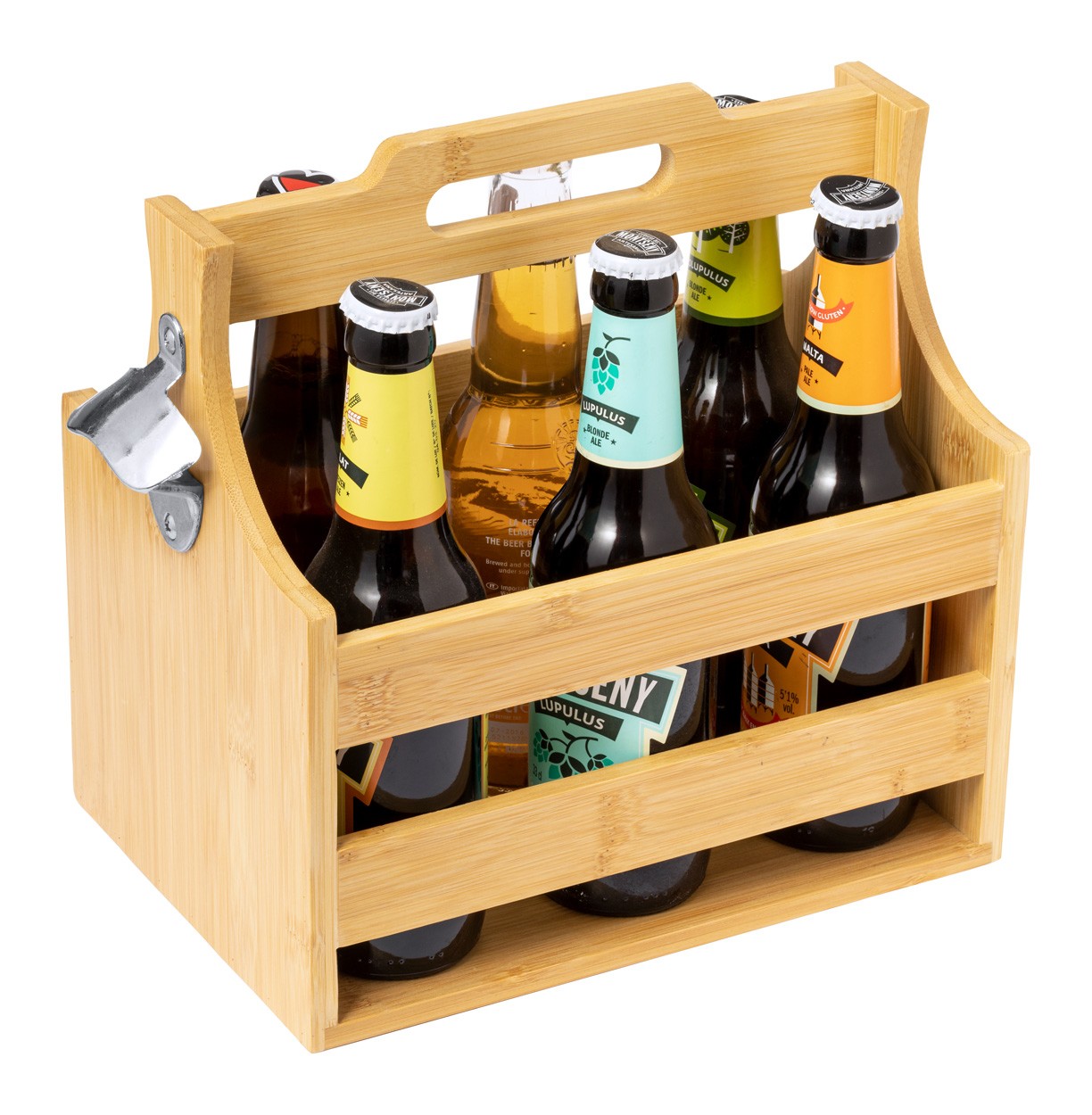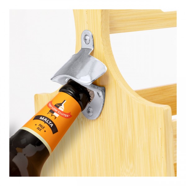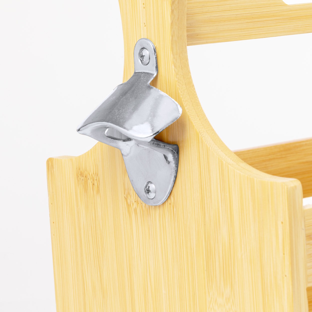 Suport pentru sticle de bere, din bambus, cu deschizător de sticle. Pentru 6 sticle.