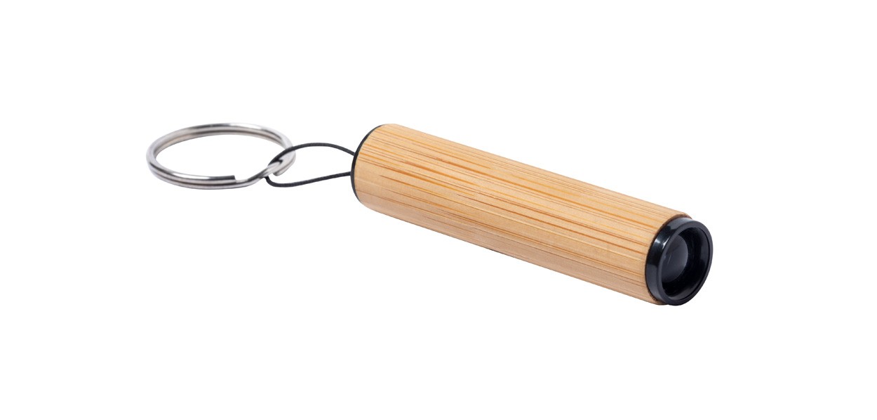 Mini lanternă din bambus cu LED alb și breloc metalic. Cu baterie buton.