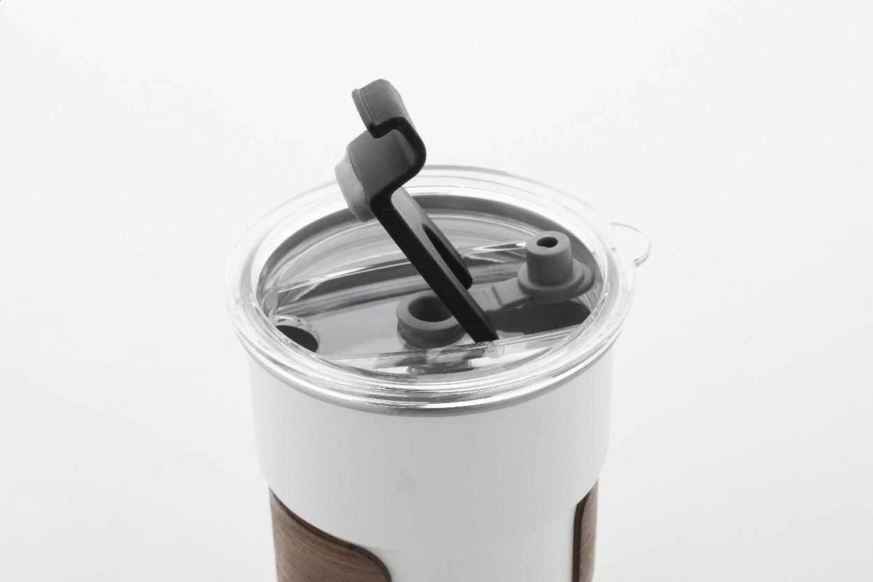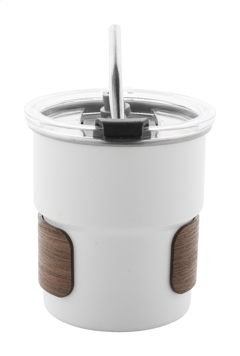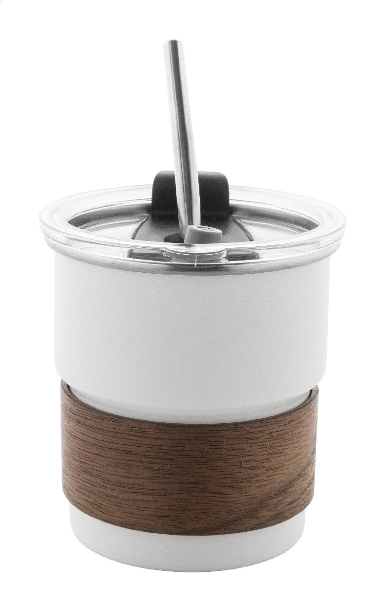 Pahar de voiaj, din oțel inoxidabil reciclat, cu perete simplu, mâner din lemn de nuc, capac din plastic și pai din oțel inoxidabil reciclat. 260 ml.