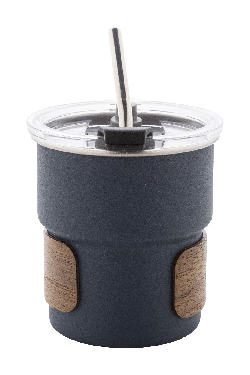 Pahar de voiaj, din oțel inoxidabil reciclat, cu perete simplu, mâner din lemn de nuc, capac din plastic și pai din oțel inoxidabil reciclat. 260 ml.