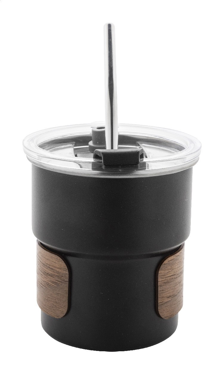 Pahar de voiaj, din oțel inoxidabil reciclat, cu perete simplu, mâner din lemn de nuc, capac din plastic și pai din oțel inoxidabil reciclat. 260 ml.