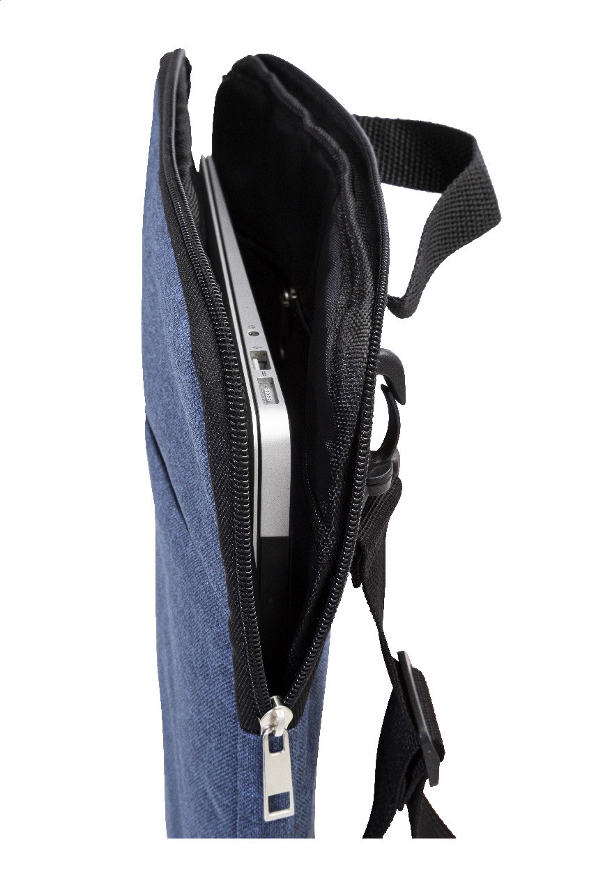 Geantă de umăr, căptușită, pentru documente sau laptop, din poliester 600D RPET, cu compartiment cu fermoar și buzunar frontal cu fermoar. Potrivită pentru laptopuri de până la 15". Cu curea de umăr reglabilă în poziție verticală și orizontală. Cu etichetă distinctivă RPET.