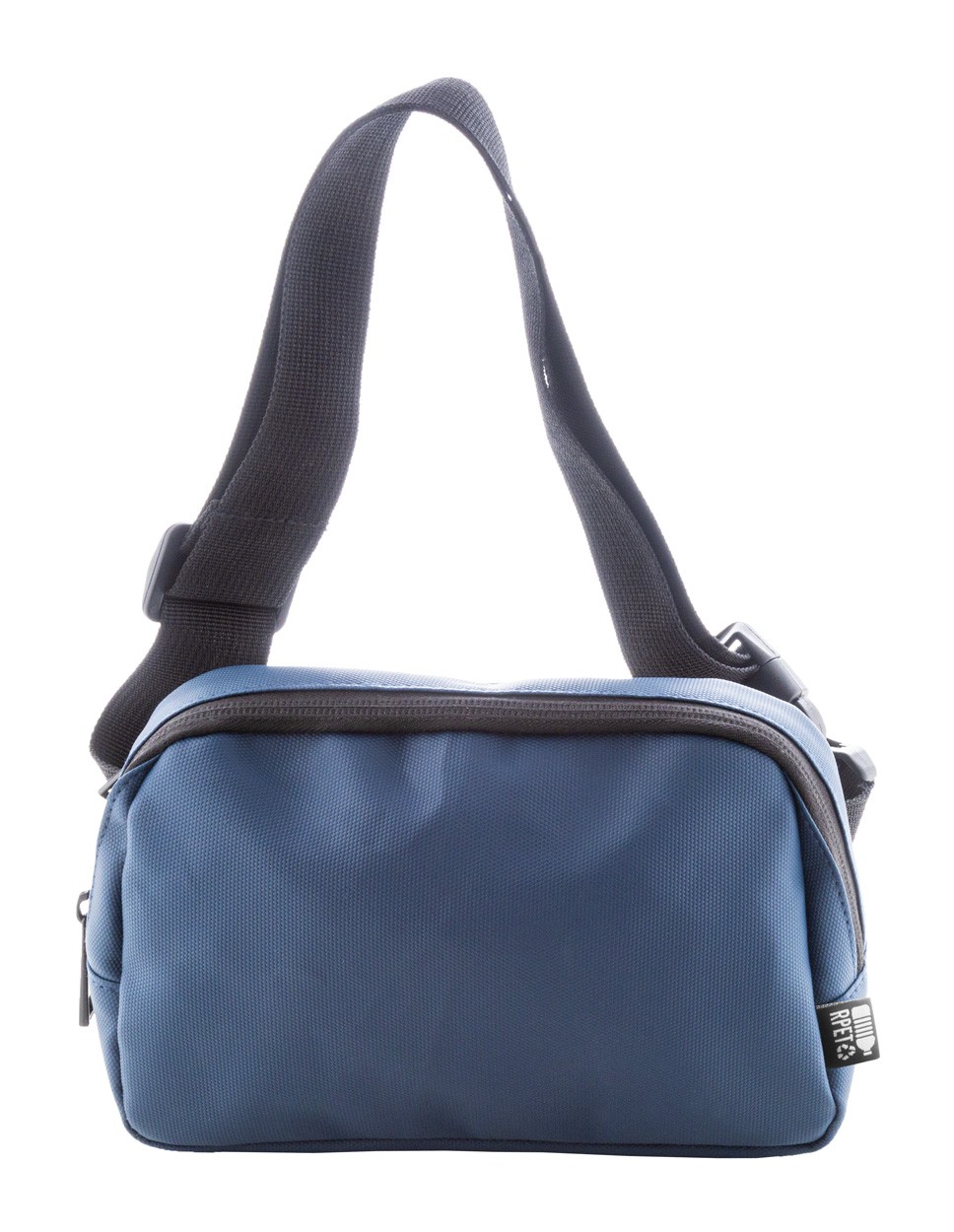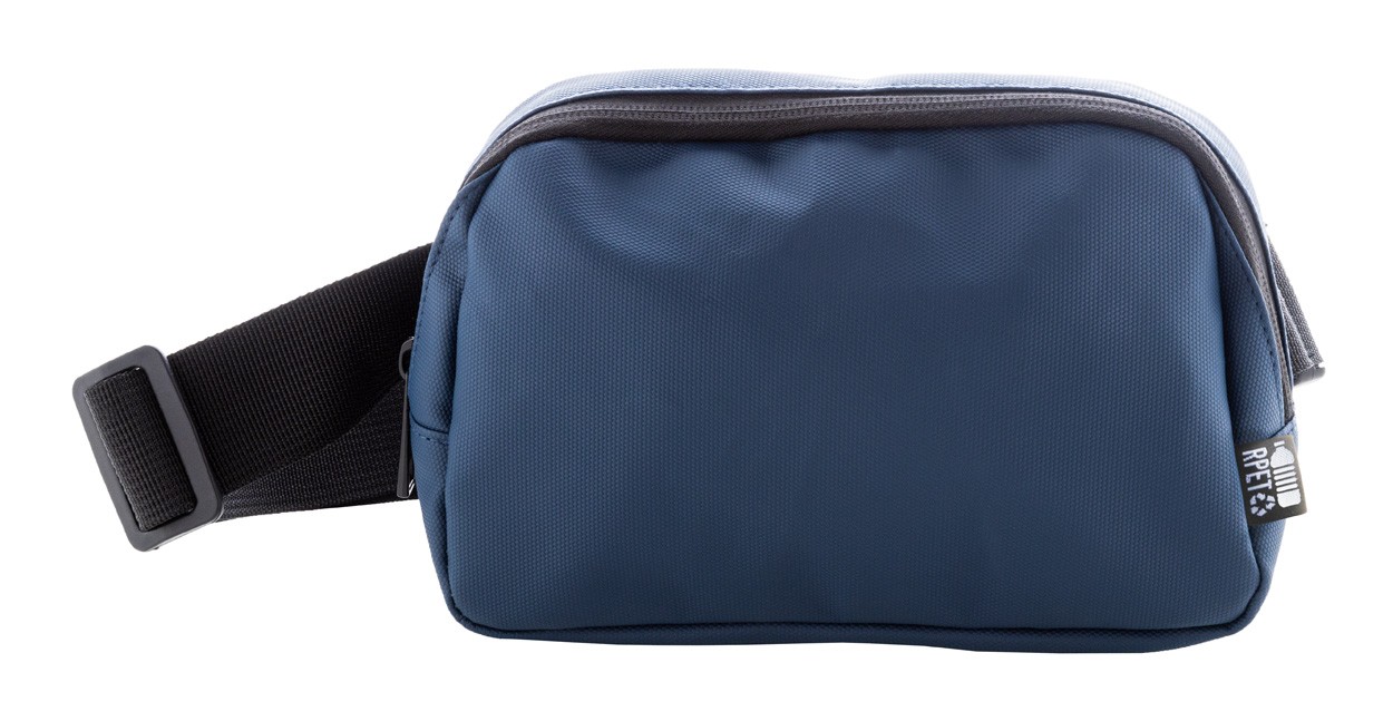 Geantă de talie, RPET impermeabilă, cu 2 compartimente cu fermoar, plasă în interiorul buzunarelor organizatoare și curea reglabilă. Poliester 600D RPET acoperit cu PU, cu etichetă RPET distinctă.
