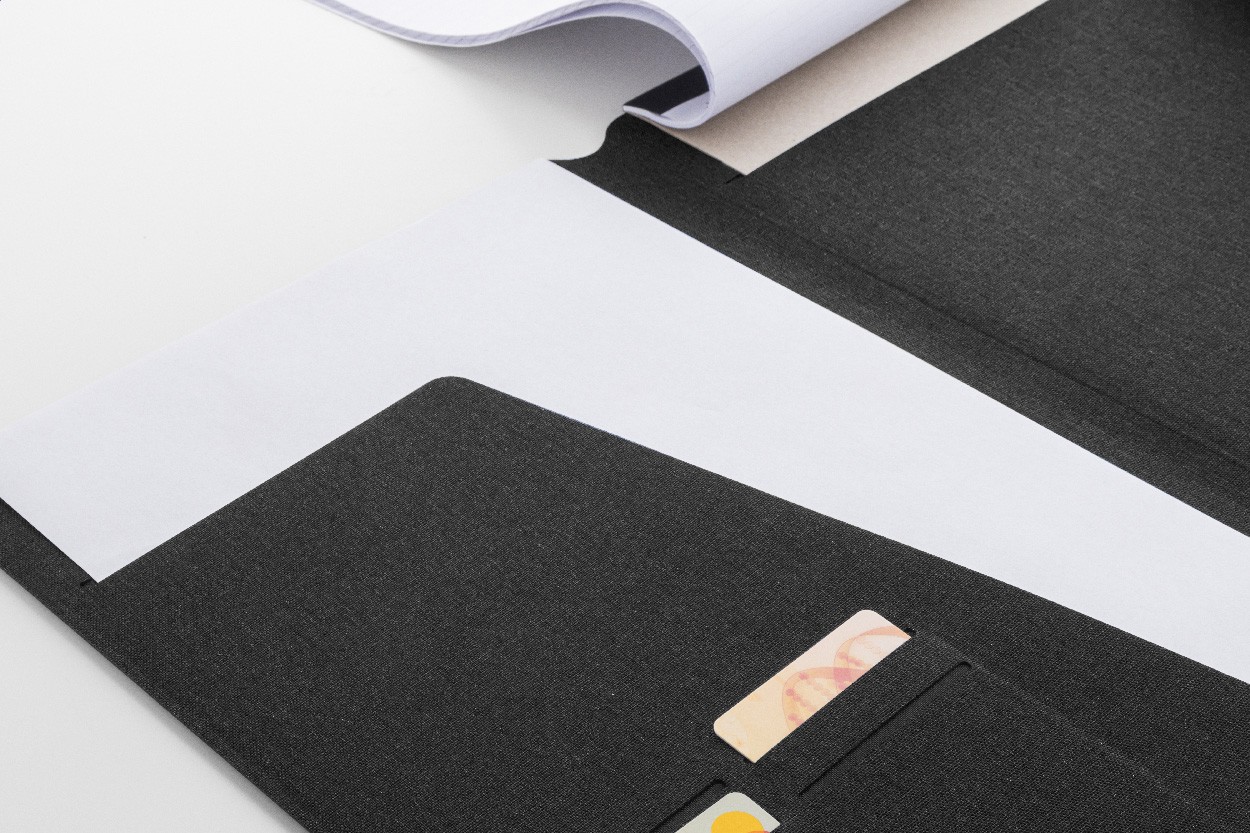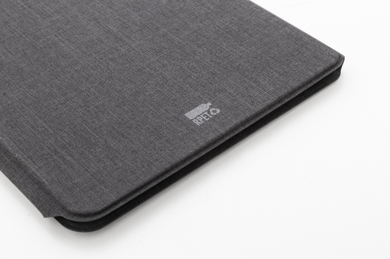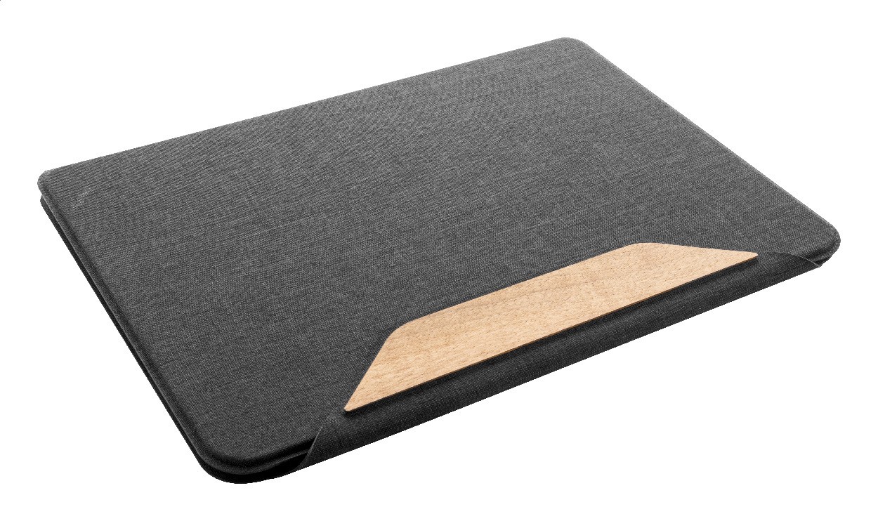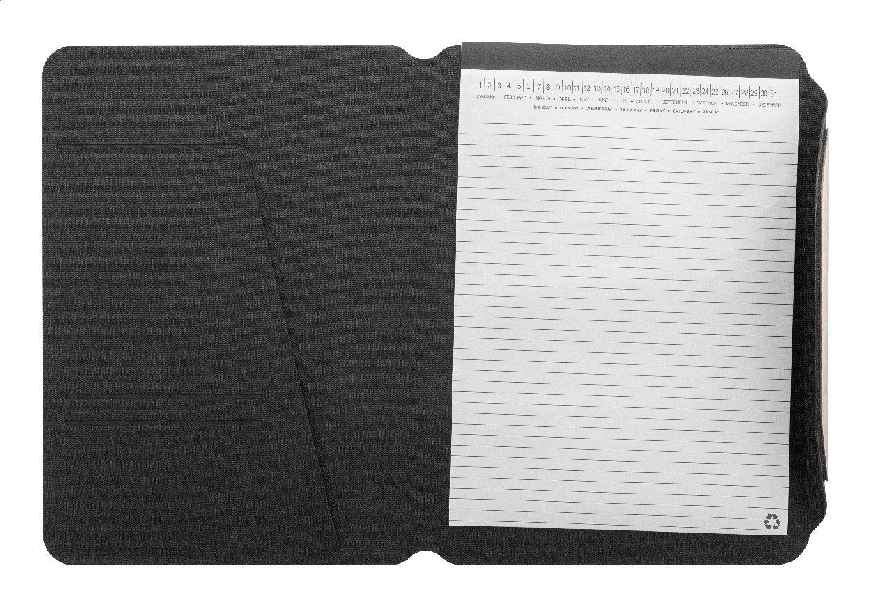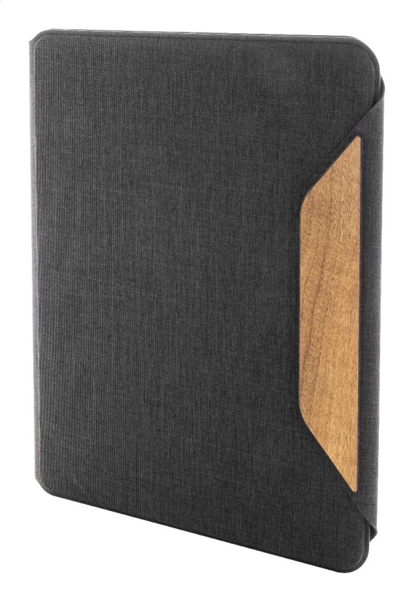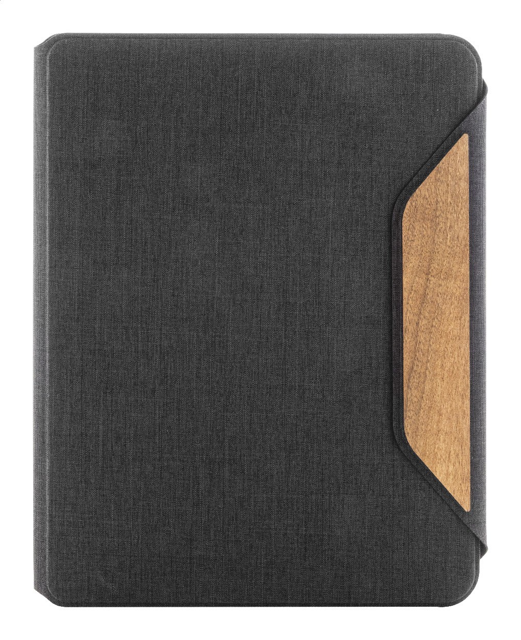 Mapă de documente, format A4, din poliester RPET, cu buzunare interioare multiple și închidere magnetică cu detalii din lemn de nuc. Blocnotes cu 20 de foi dictando, din hârtie reciclată.