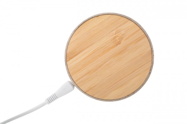 Încărcător rapid wireless (15W), din plastic ecologic din paie de grâu și carcasă din bambus. Inclusiv cablu de încărcare USB.