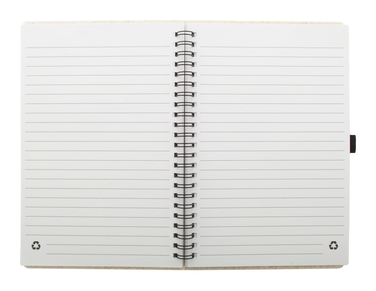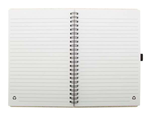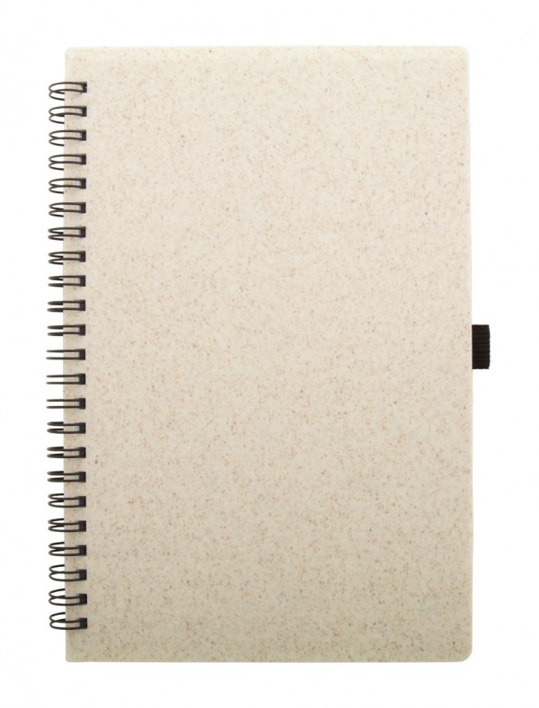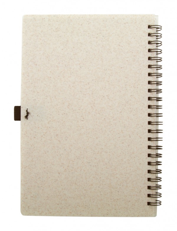 Caiet ecologic, spiralat, cu cupertă din plastic din paie de grâu, cu 70 de foi în hârtie reciclată și suport pentru pix, dimensiune A5.
