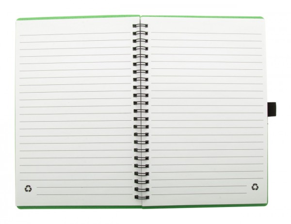 Caiet ecologic, spiralat, cu cupertă din plastic din paie de grâu, cu 70 de foi în hârtie reciclată și suport pentru pix, dimensiune A5.