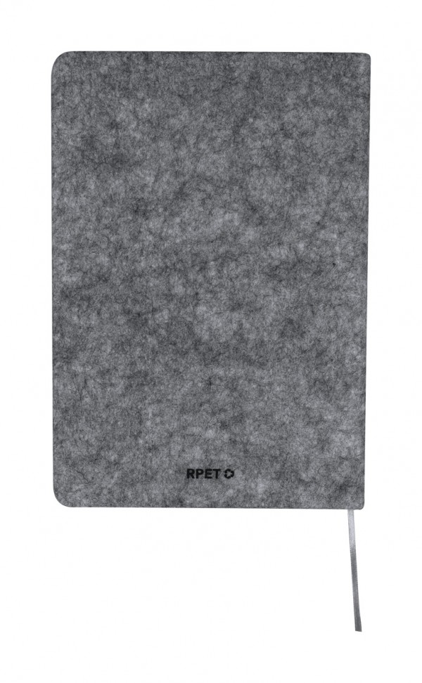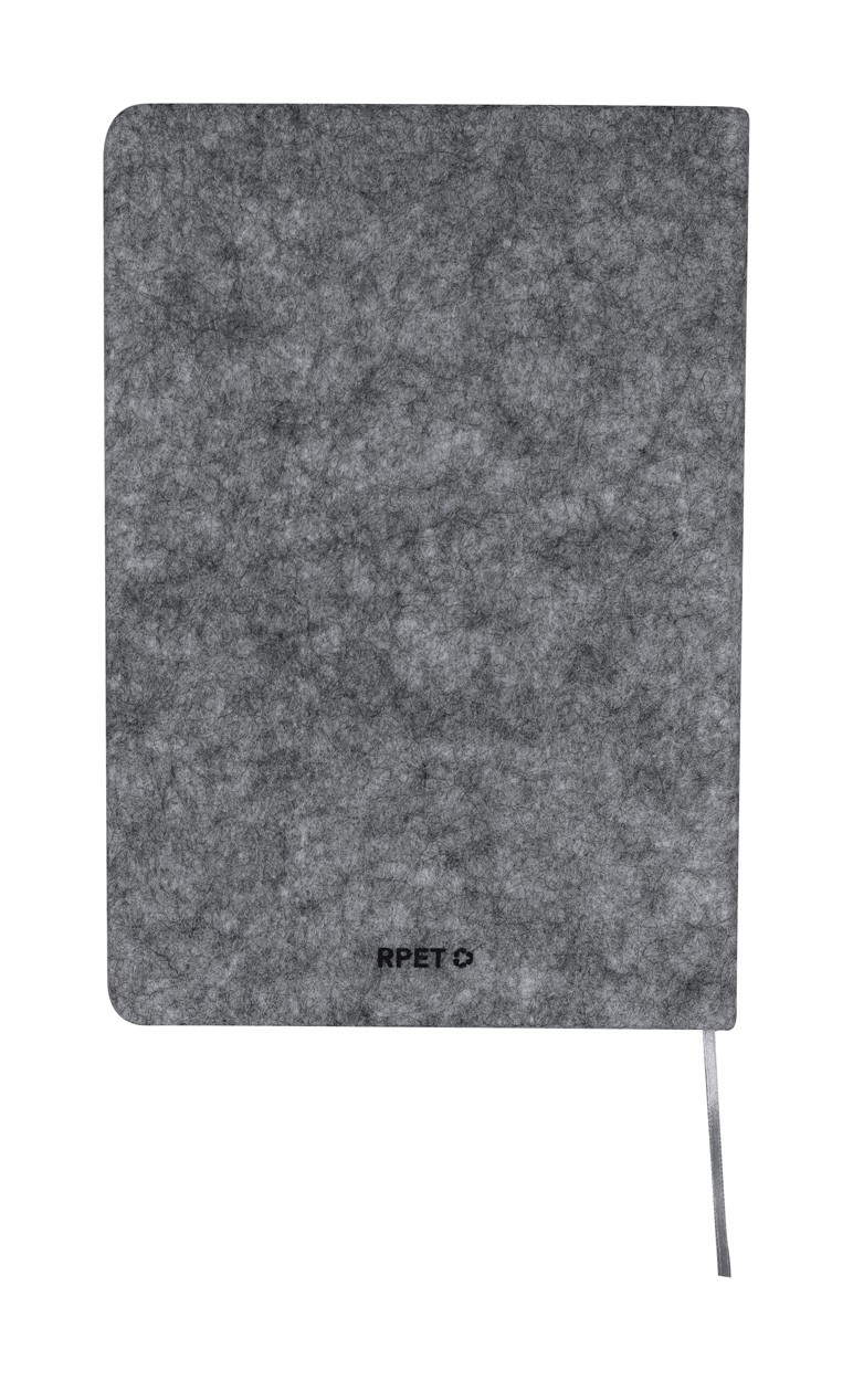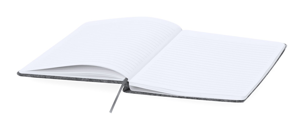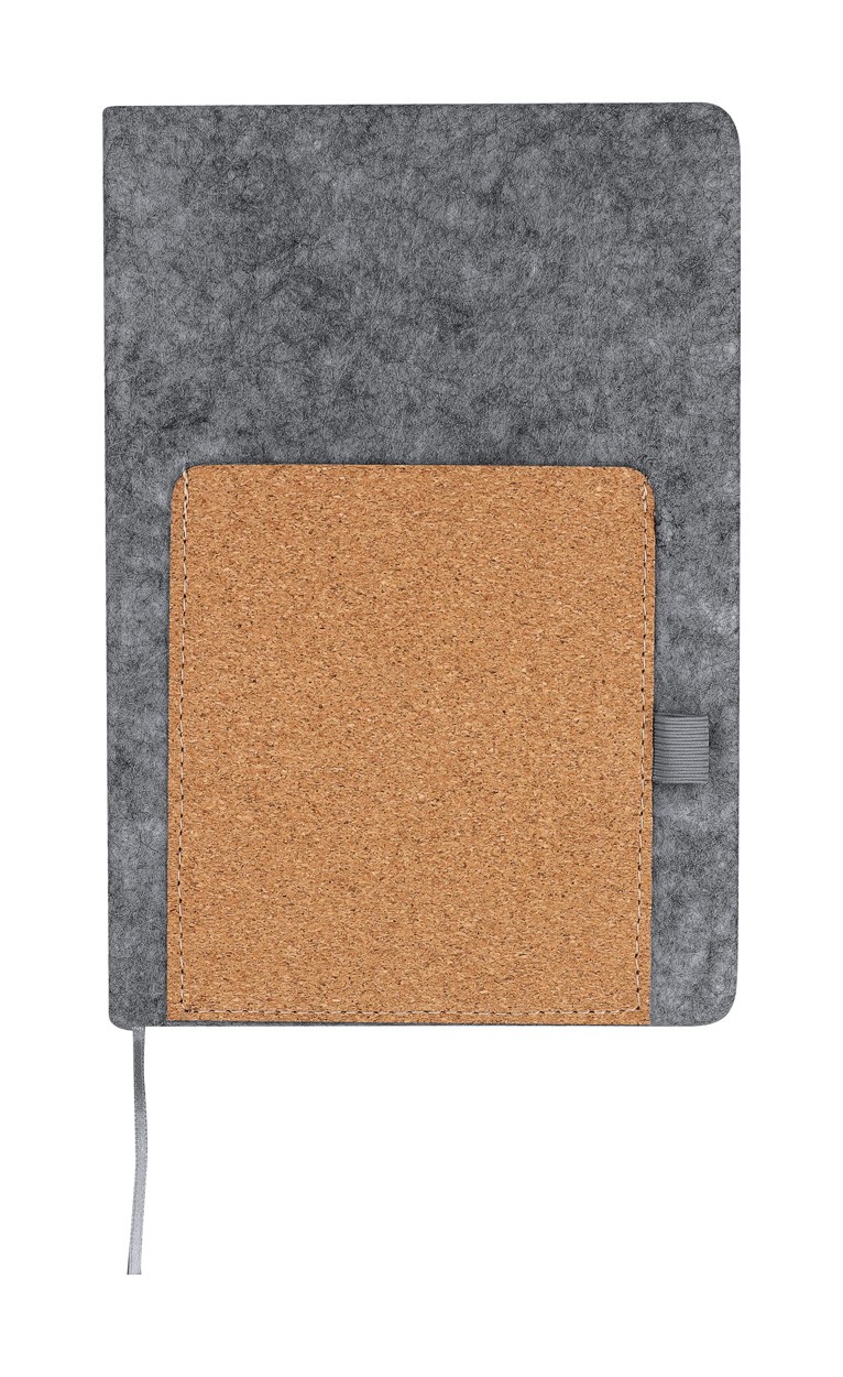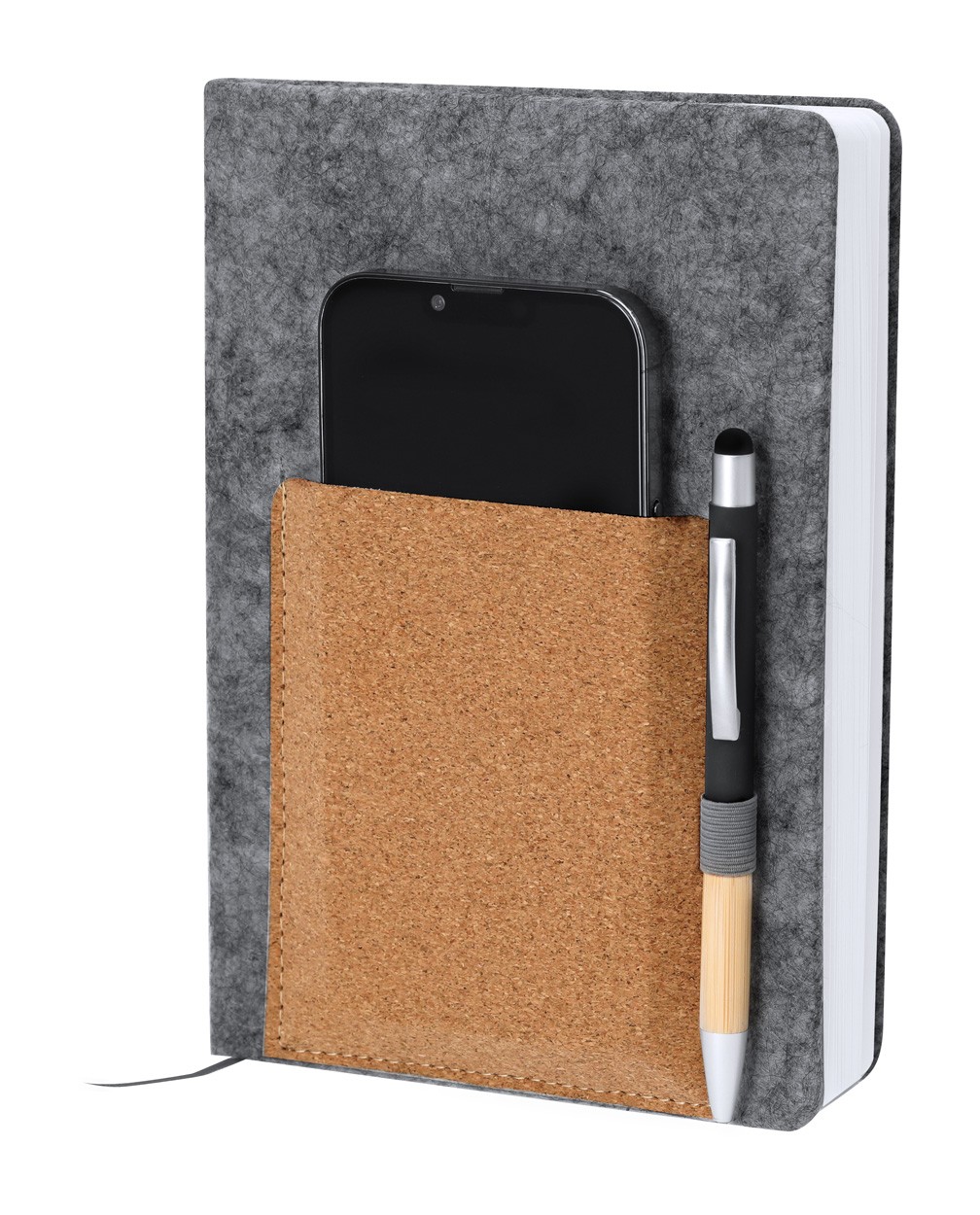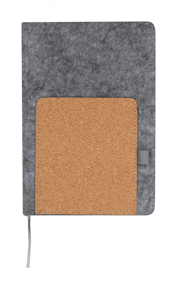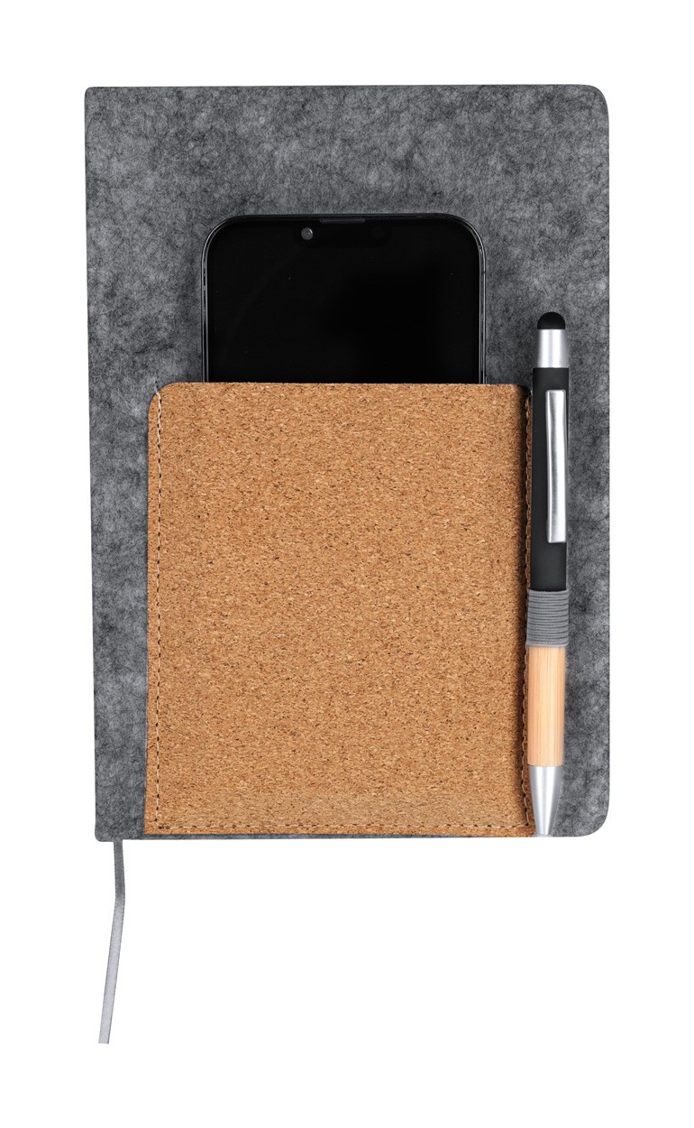 Agendă cu copertă din fetru RPET, cu suport mobil din plută naturală, suport stilou și semn carte. Cu 80 de foi dictando. Dimensiune A5.