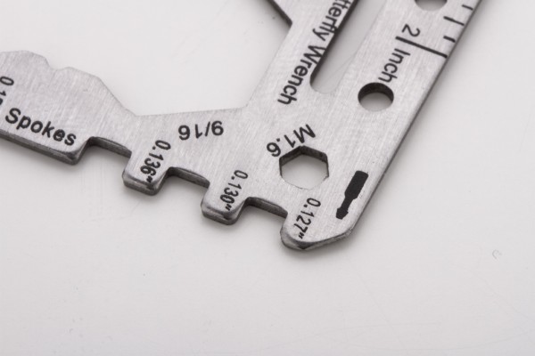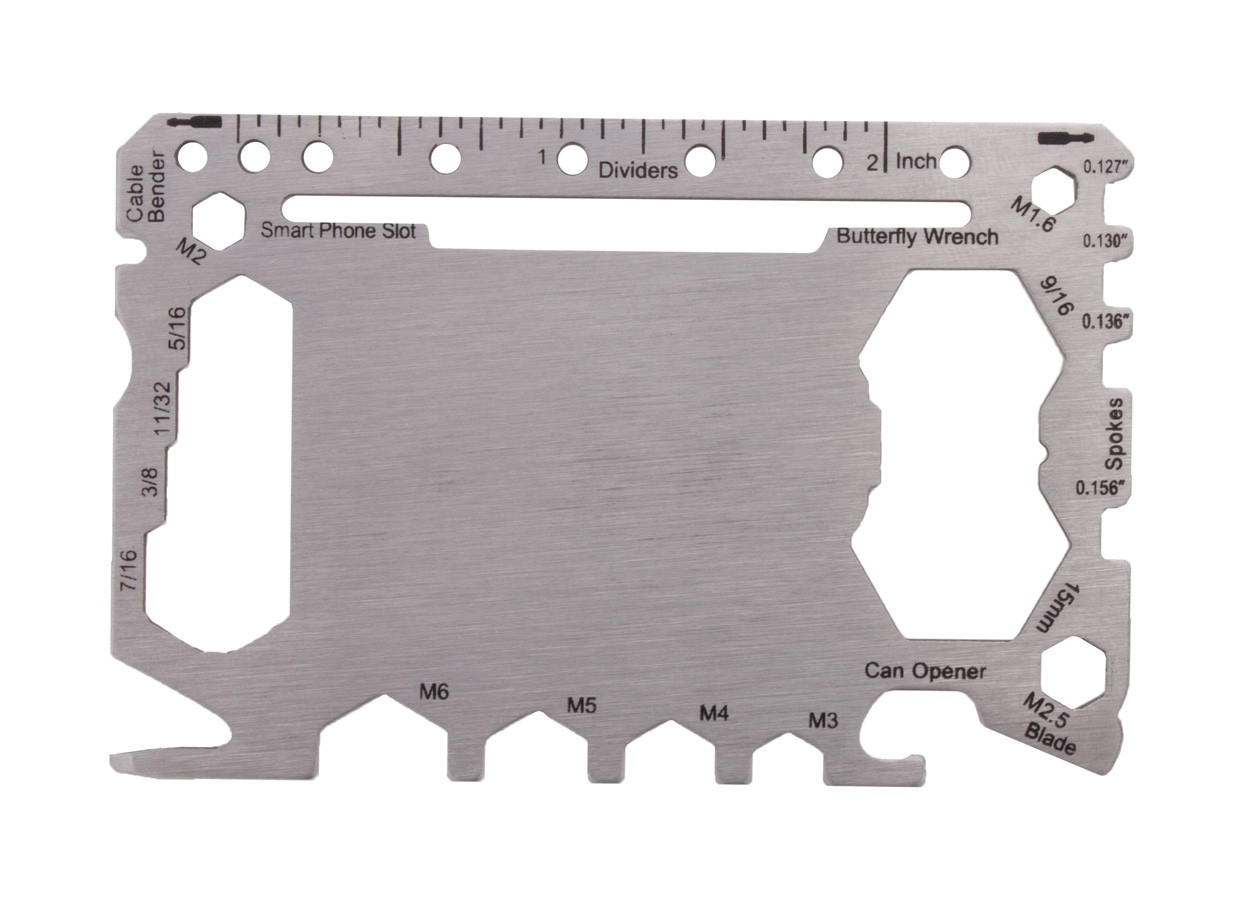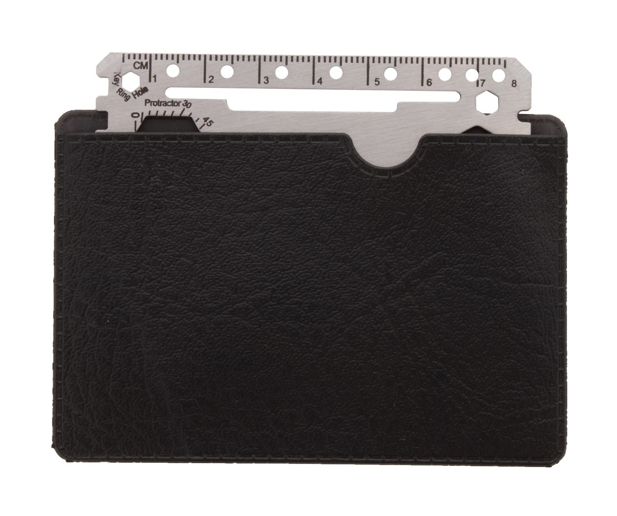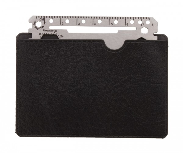Unealtă multifuncțională, din oțel inoxidabil, în formă de card de credit, cu 20 de funcții, în husă din piele PU.