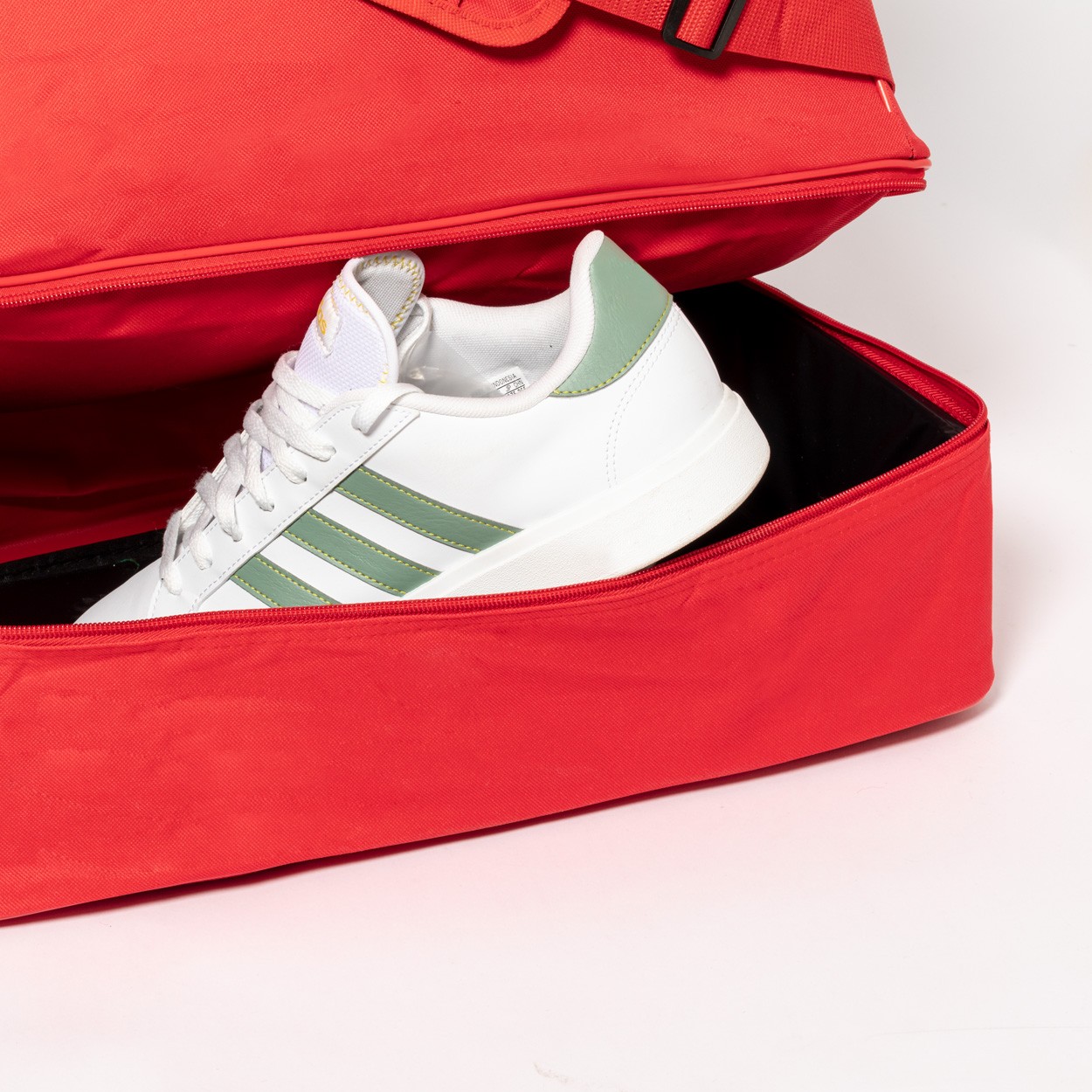 Geantă sport RPET, cu compartimente cu fermoar, compartiment pentru pantofi și curea de umăr reglabilă. Poliester 600D RPET, cu etichetă distinctivă RPET.