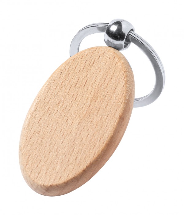Breloc din lemn de fag, natural, cu inel metalic.