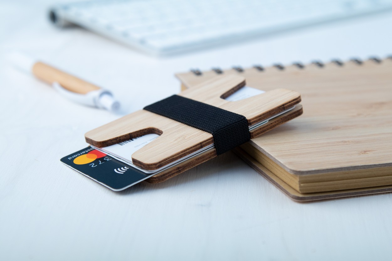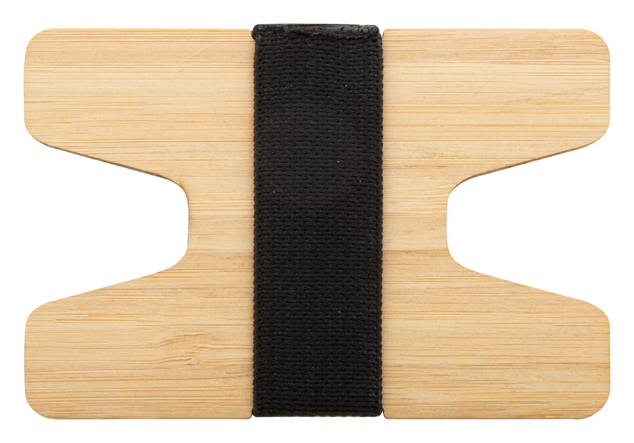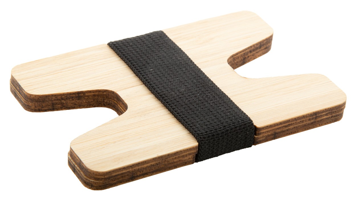 Portofel tip suport carduri, din placaj de bambus, cu banda elastics din cauciuc.
