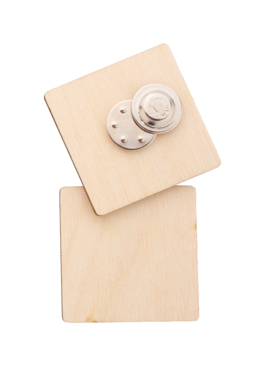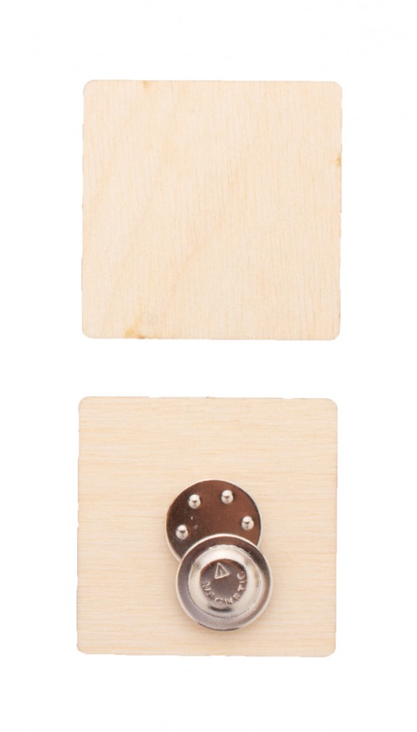 Ecuson din placaj de mesteacăn, realizat la comandă, cu știft magnetic și imprimare color. Pretul include imprimarea UV LED. MOQ: 100 buc.