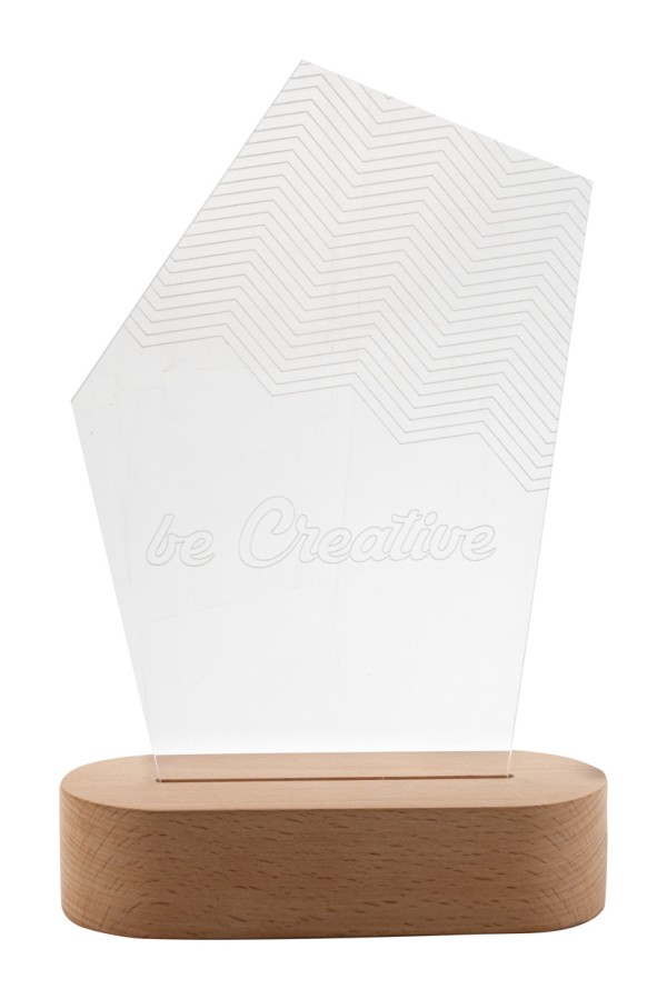 Trofeu acrilic, realizat la comandă, pe bază de lemn cu lumină LED multicolor alimentată prin USB. Într-o formă unică, cu grafică gravată. Cu cablu de încărcare USB. Prețul include gravura. MOQ: 25 buc.