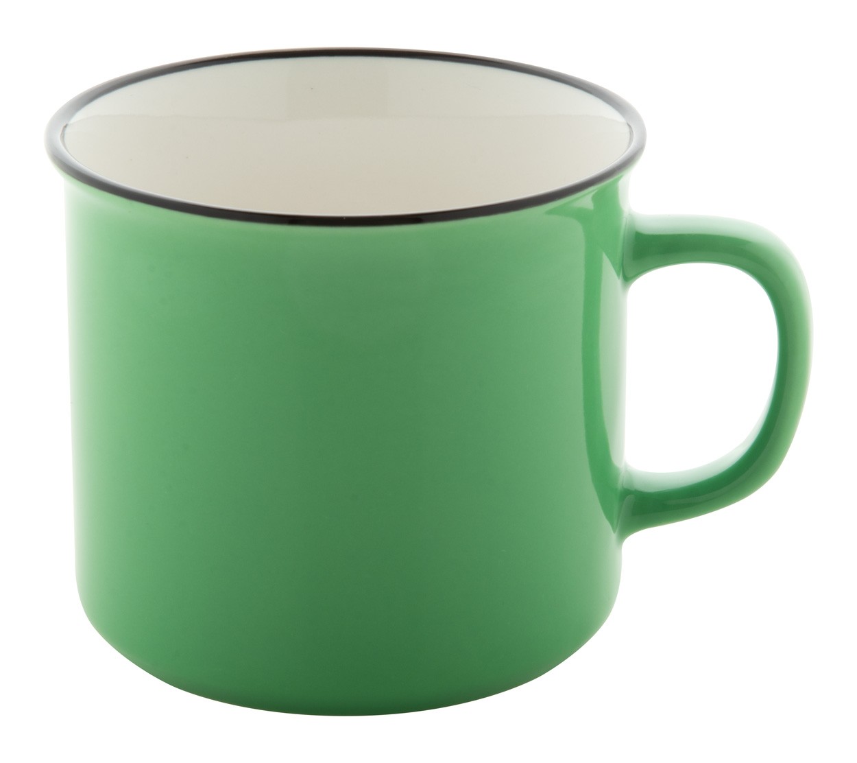 Cană ceramică vintage cu marginea neagră, interior alb și exterior colorat, 300 ml. Se livrează în cutie de cadou.