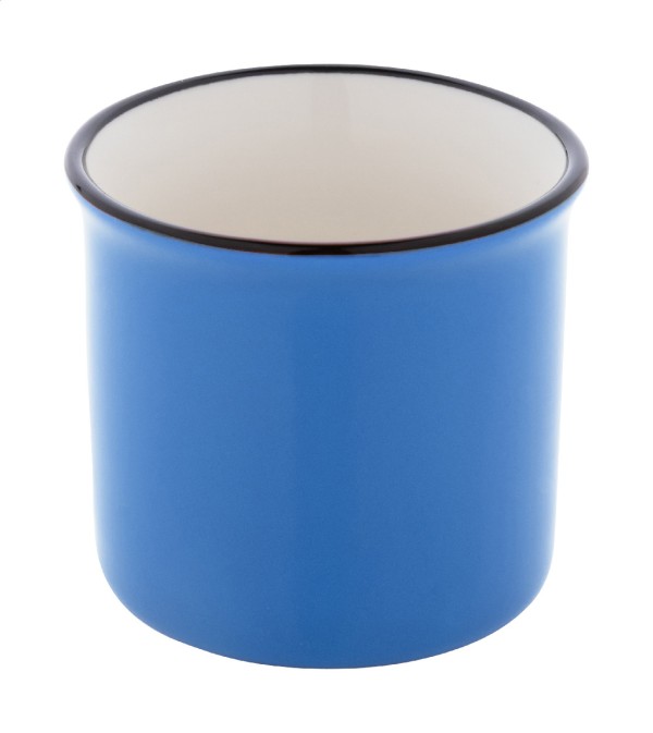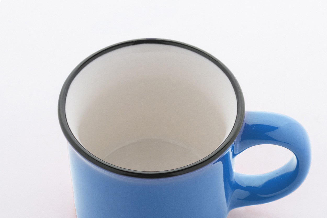 Cană ceramică, mini, vintage, cu margine neagră, interior alb și exterior colorat, 90 ml. În cutie de hârtie kraft.