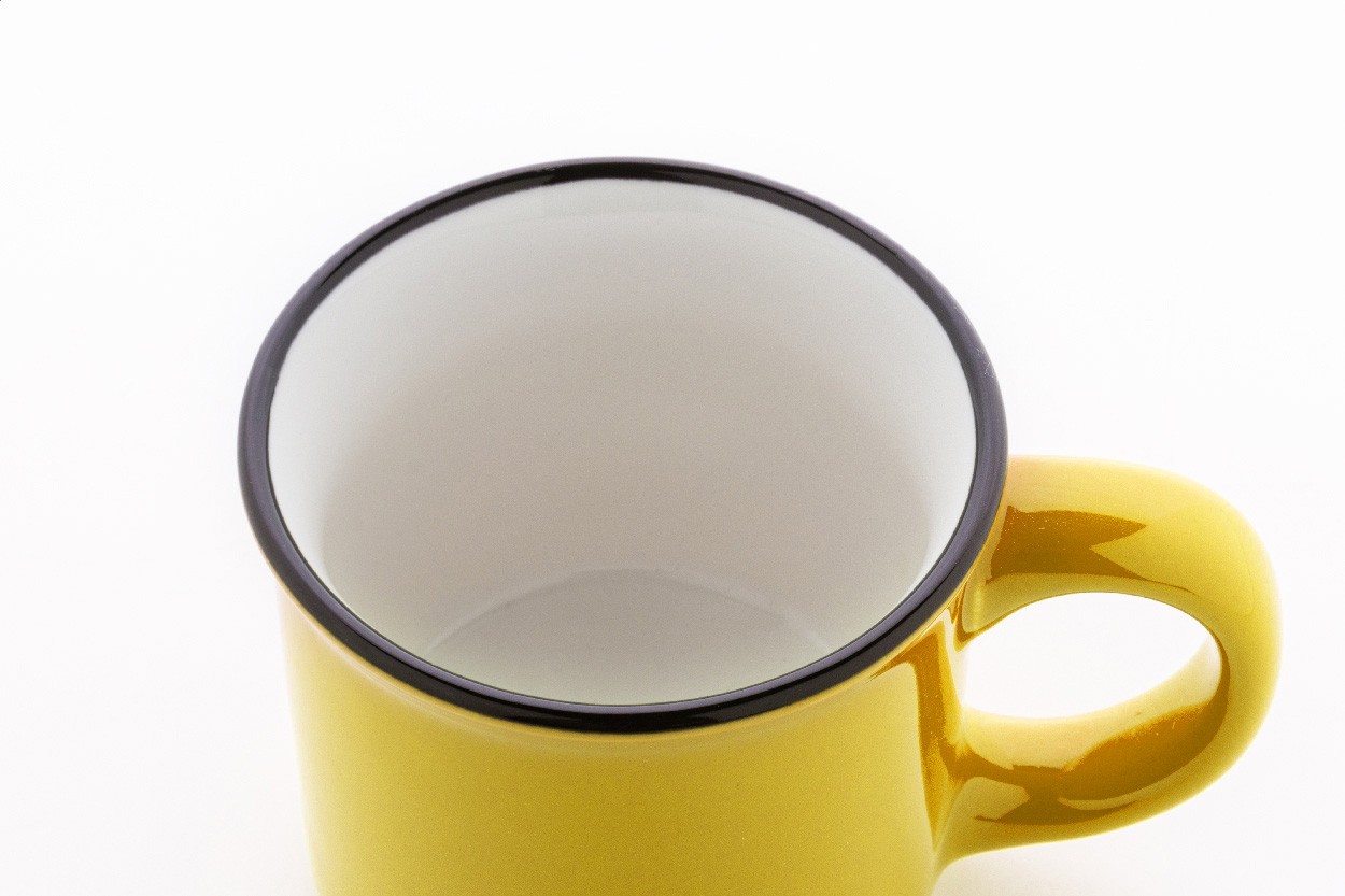 Cană ceramică, mini, vintage, cu margine neagră, interior alb și exterior colorat, 90 ml. În cutie de hârtie kraft.