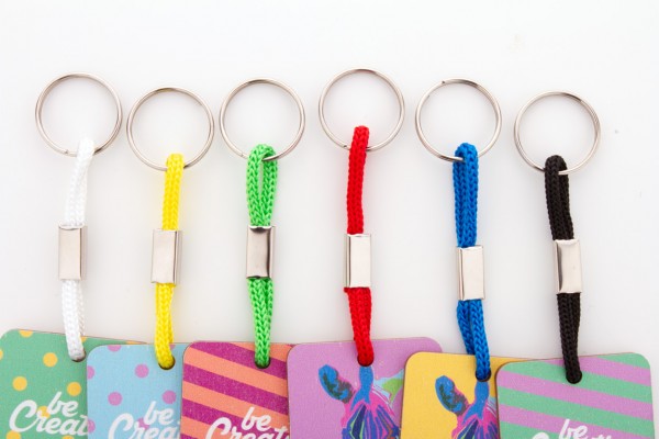 Breloc din placaj de mesteacăn, în formă pătrată, cu șnur de poliester colorat și imprimare color. Prețul include imprimarea UV LED pe o parte. MOQ: 200 buc.