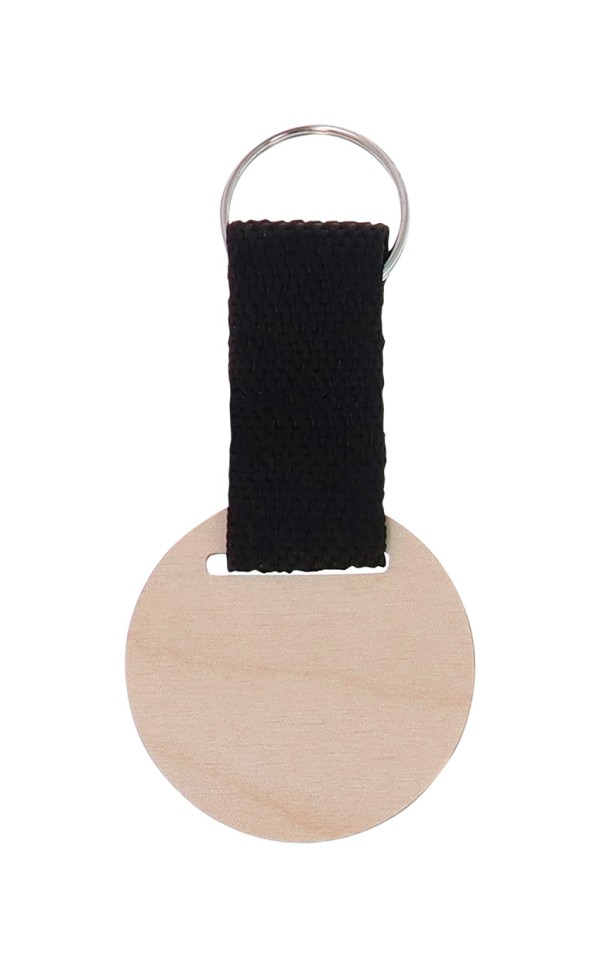 Breloc din placaj de mesteacăn, cu curea din poliester și imprimare color. Prețul include imprimarea UV LED pe o parte. MOQ: 200 buc.