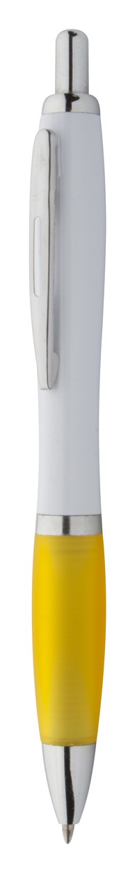 Pix din plastic, cu corp alb, inserție colorată și părți cromate strălucitoare. Mină albastră.