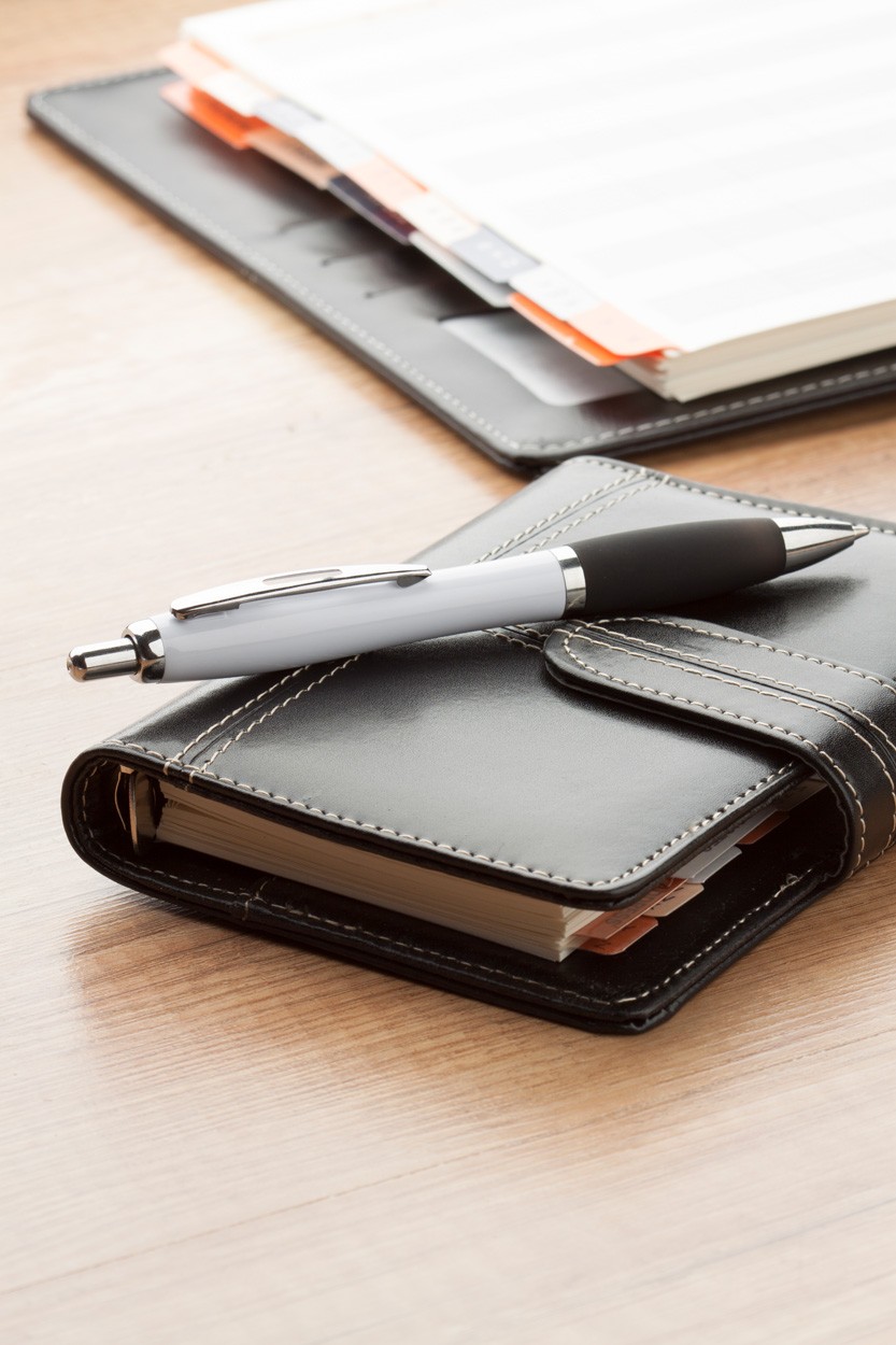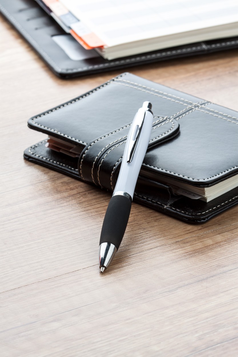 Pix din plastic, cu corp alb, inserție colorată și părți cromate strălucitoare. Mină albastră.