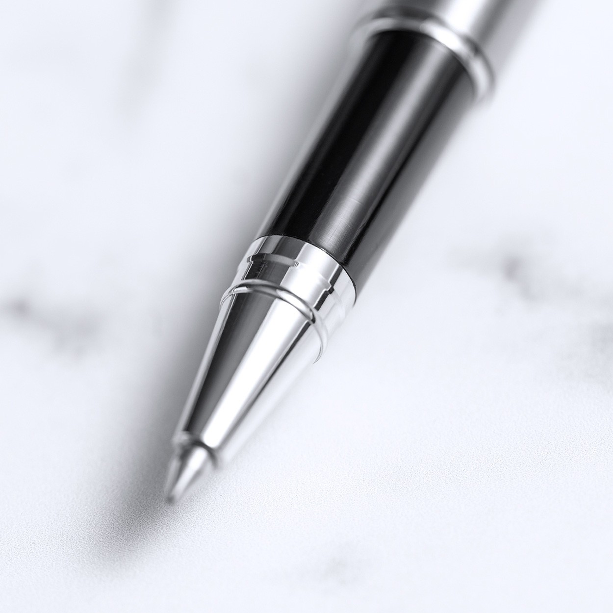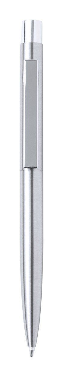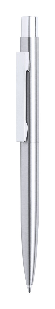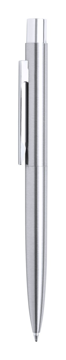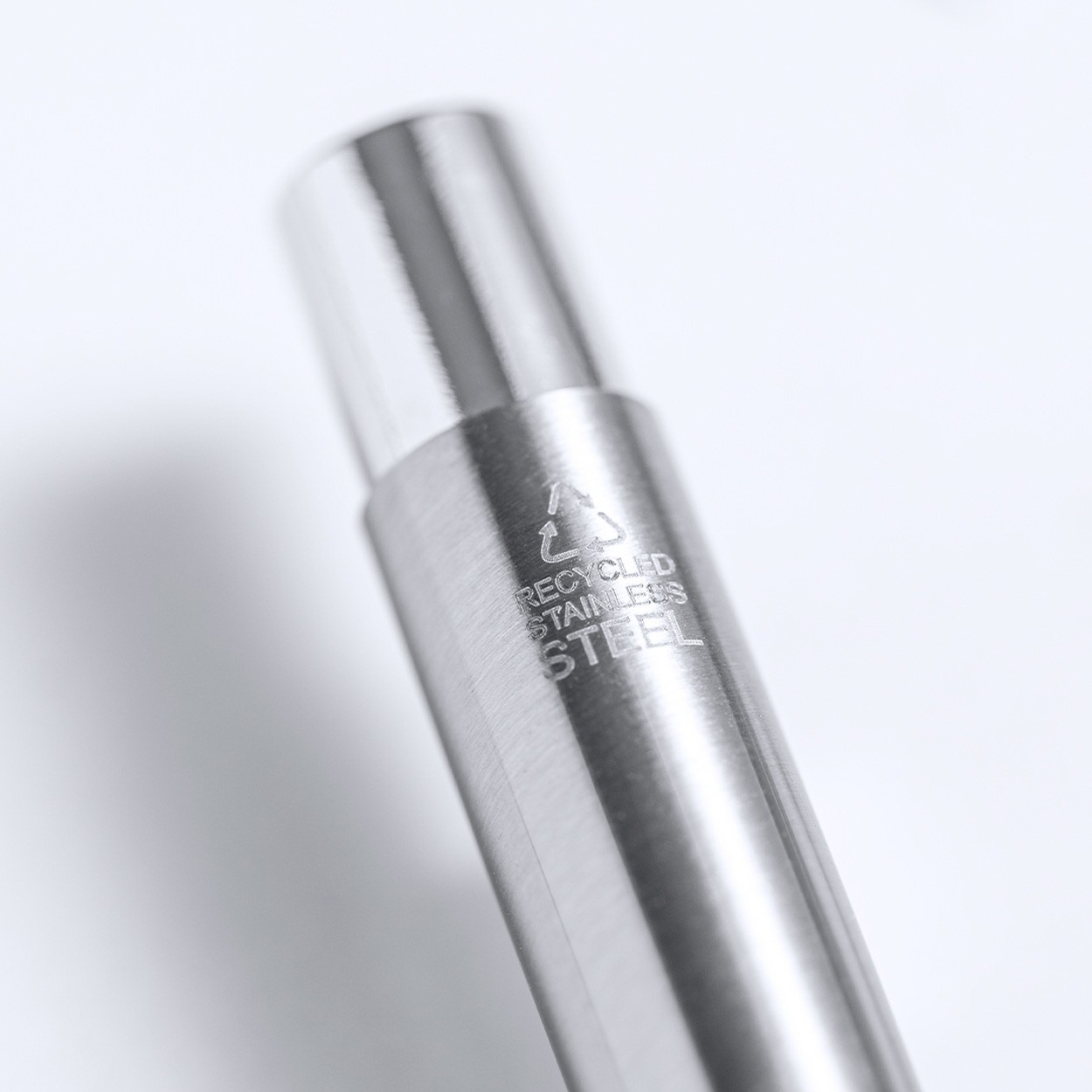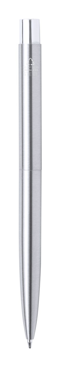 Pix din oțel inoxidabil, reciclat, cu finisaj argintiu și detalii cromate. Cu mină albastră. În cutie de hârtie kraft.
