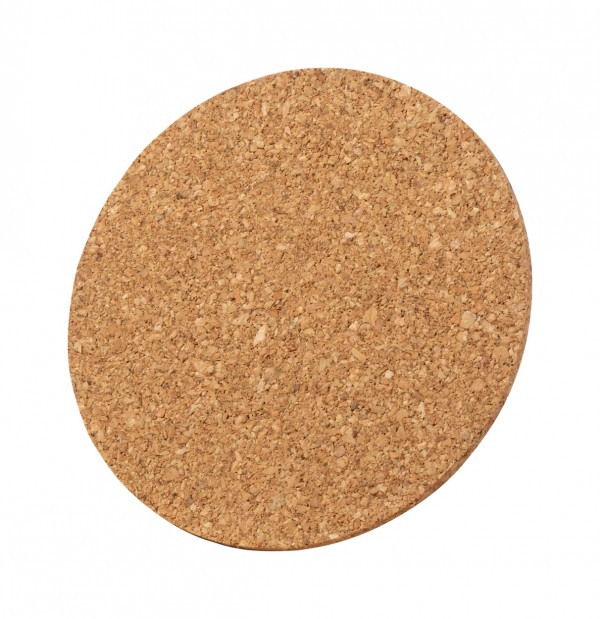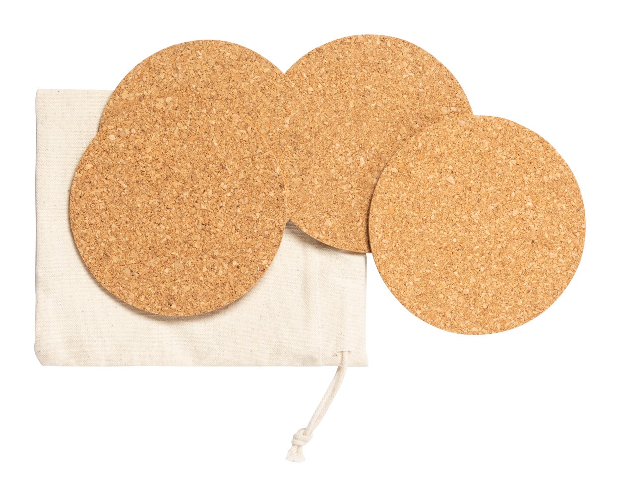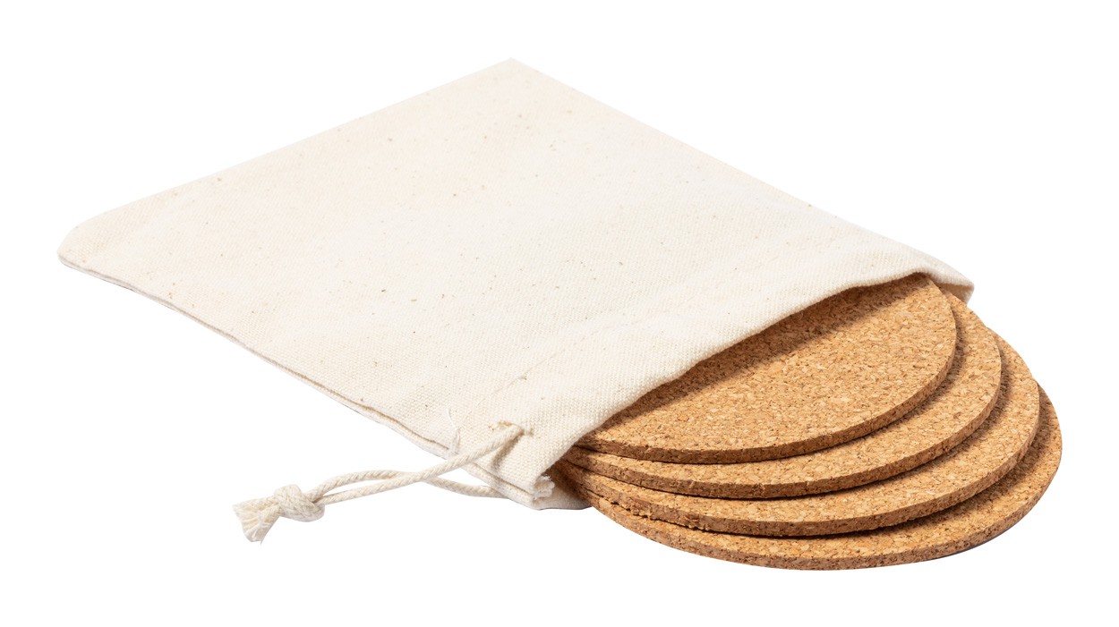 Set de 4 bucăți suport pahare, rotunde, de plută naturală, în husă din bumbac cu șnur.