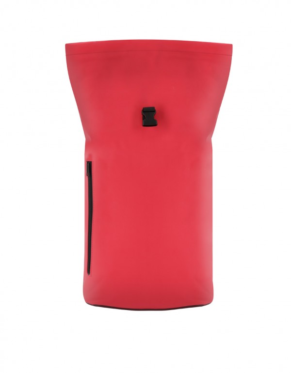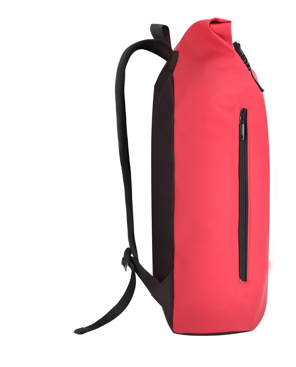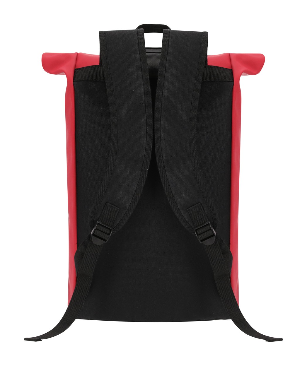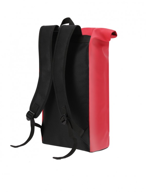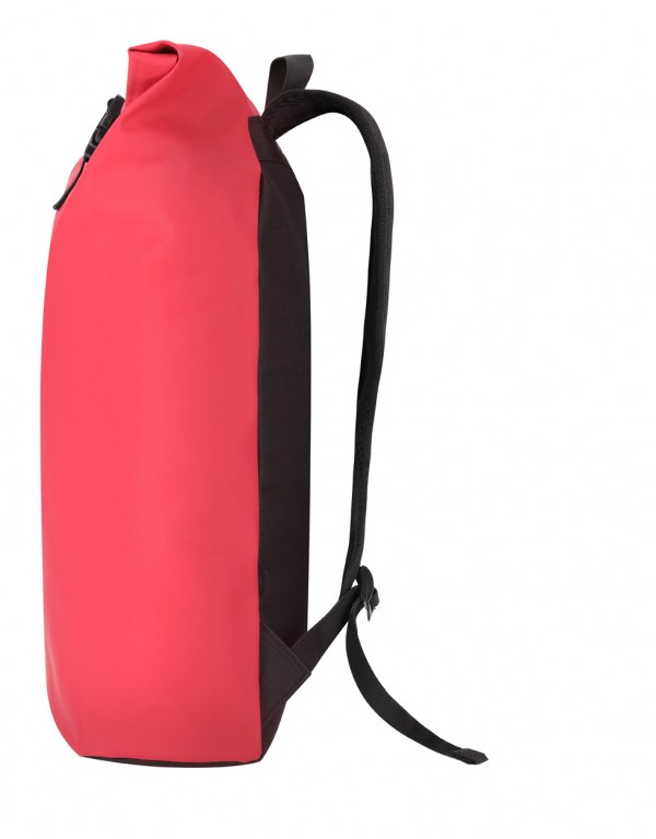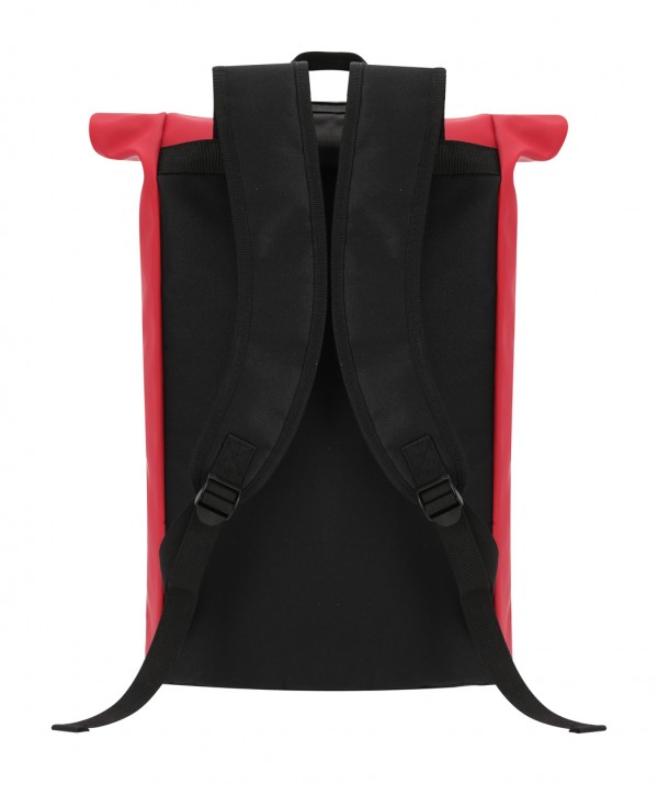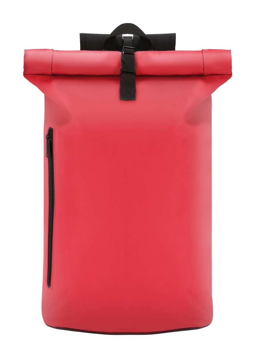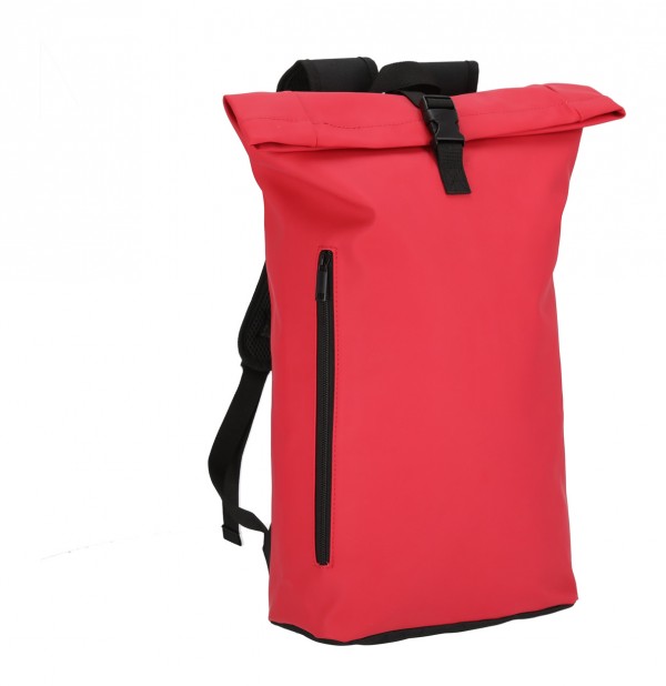 Rucsac rolltop din piele PU, soft, cu închidere cu cataramă, buzunar frontal cu fermoar, compartiment căptușit pentru laptop (15"), spate și bretele căptușite.