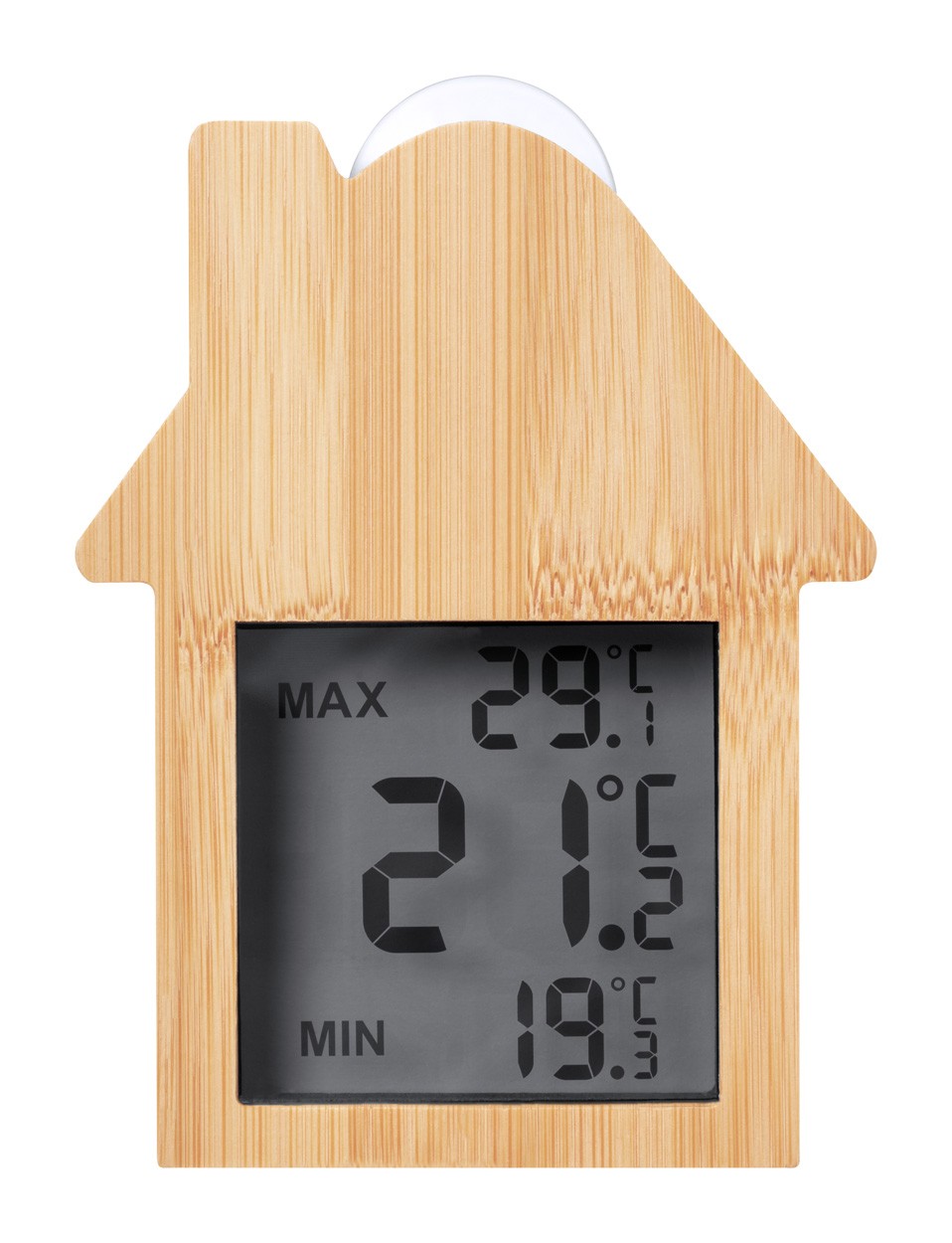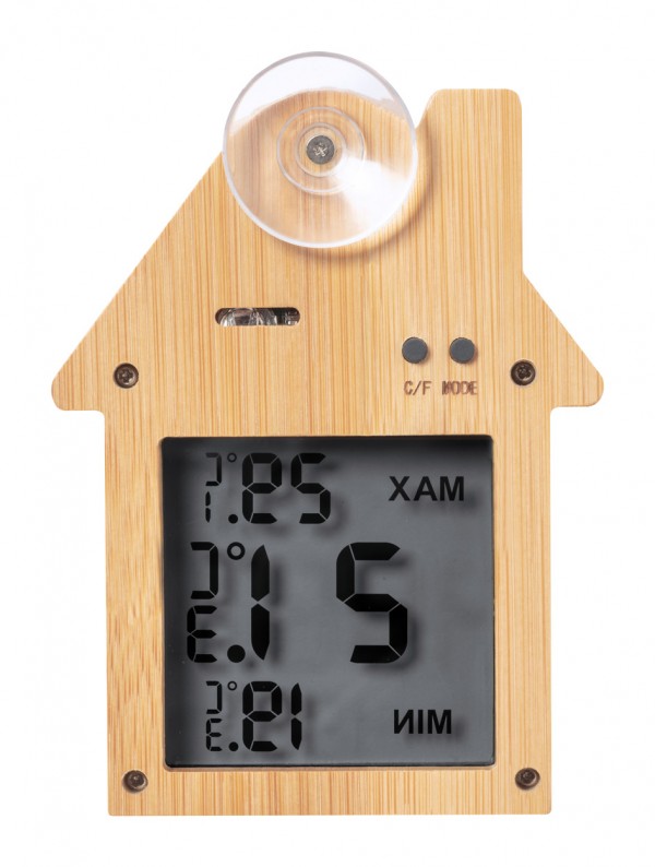 Stație meteo, din bambus, cu ventuză. Cu termometru și funcții de afișare a umidității. Inclusiv baterie tip buton.