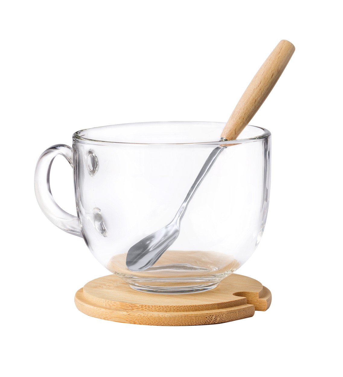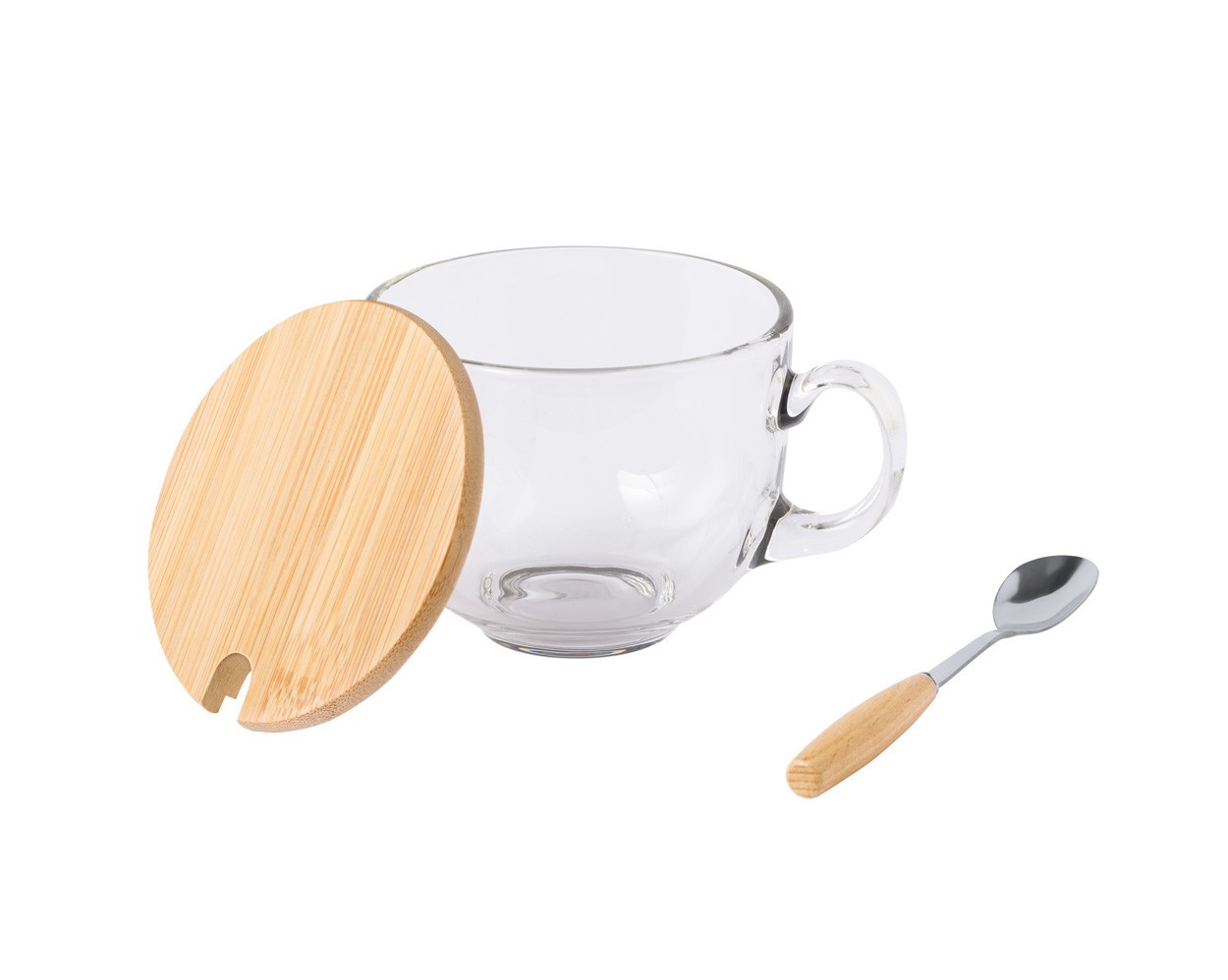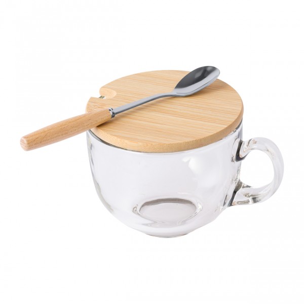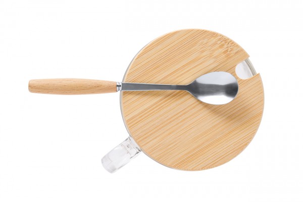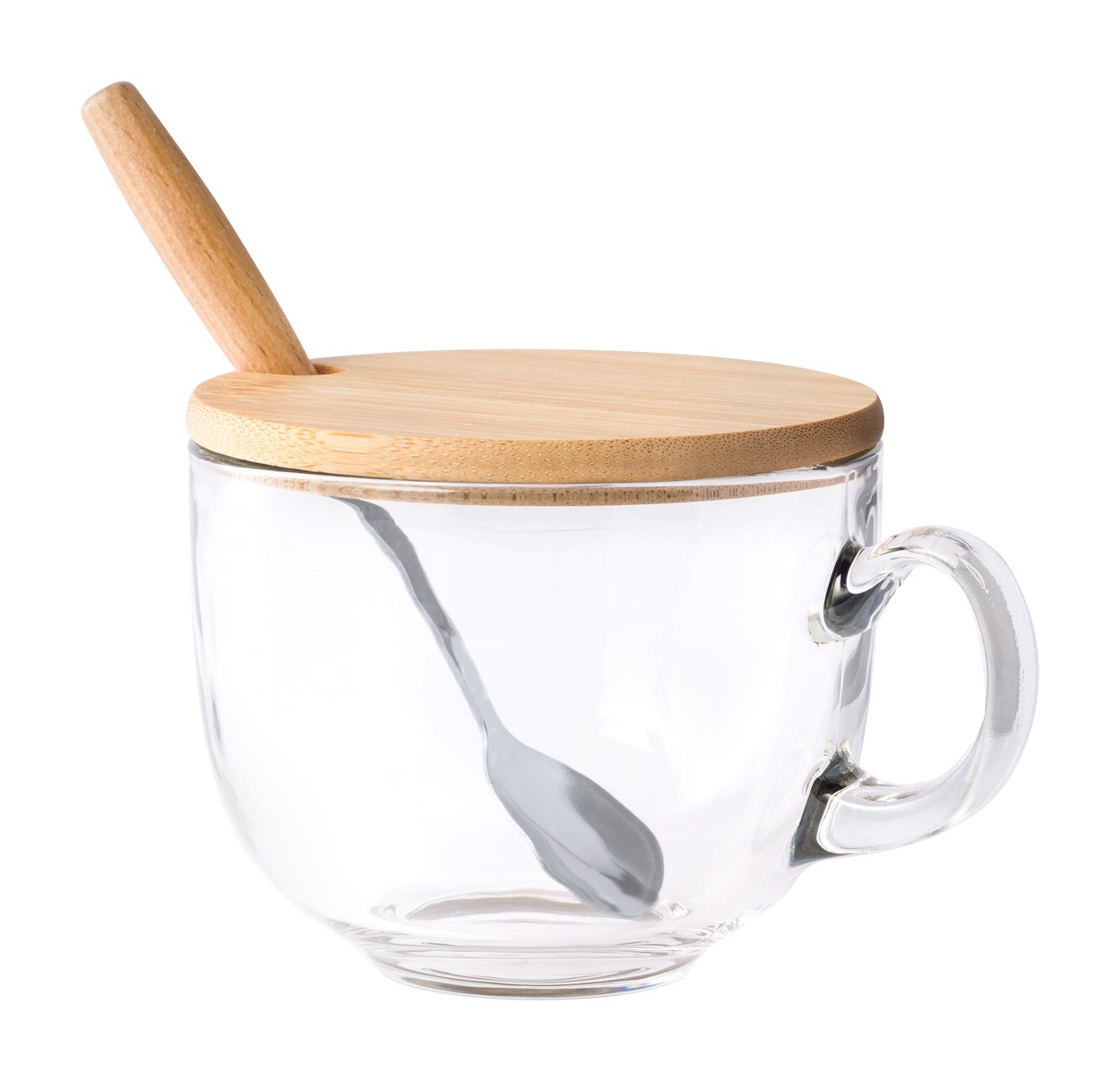 Cană de sticlă, de dimensiuni mari, cu capac din bambus și lingură asortată din oțel inoxidabil, cu mâner din lemn. 420 ml. În cutie de hârtie kraft.