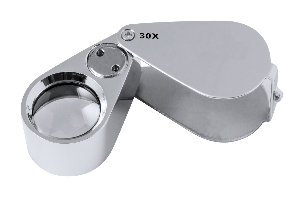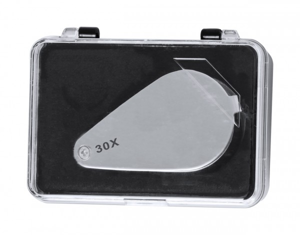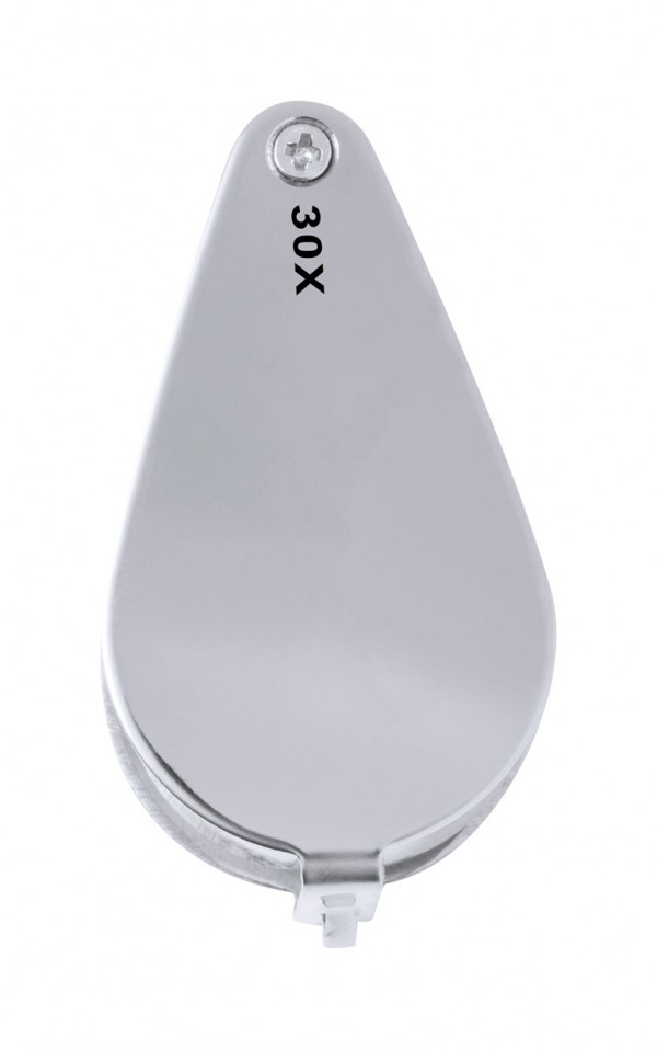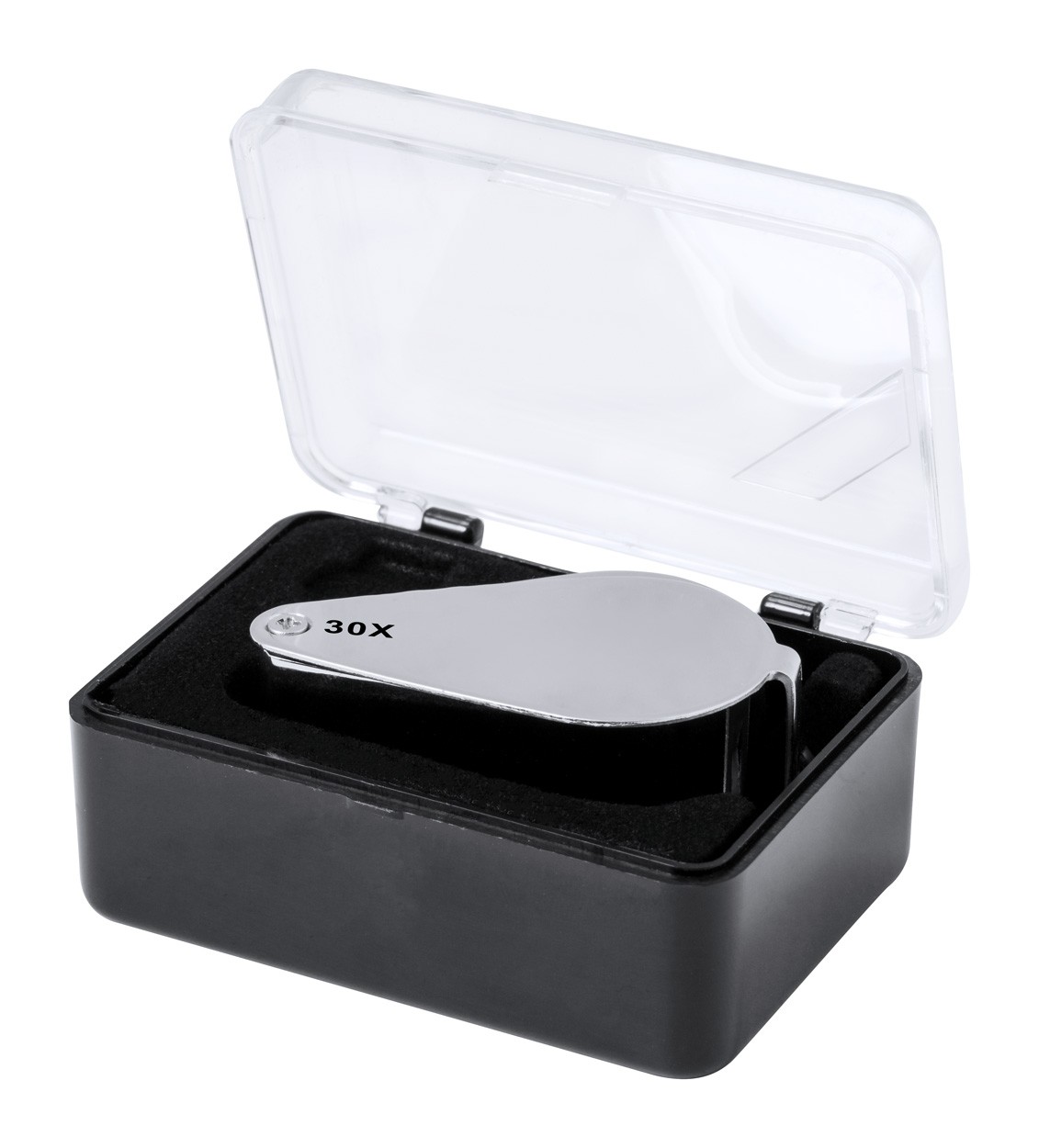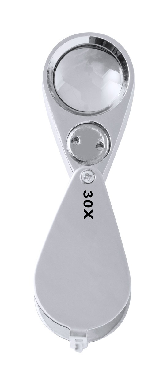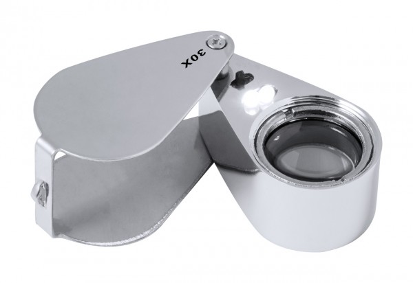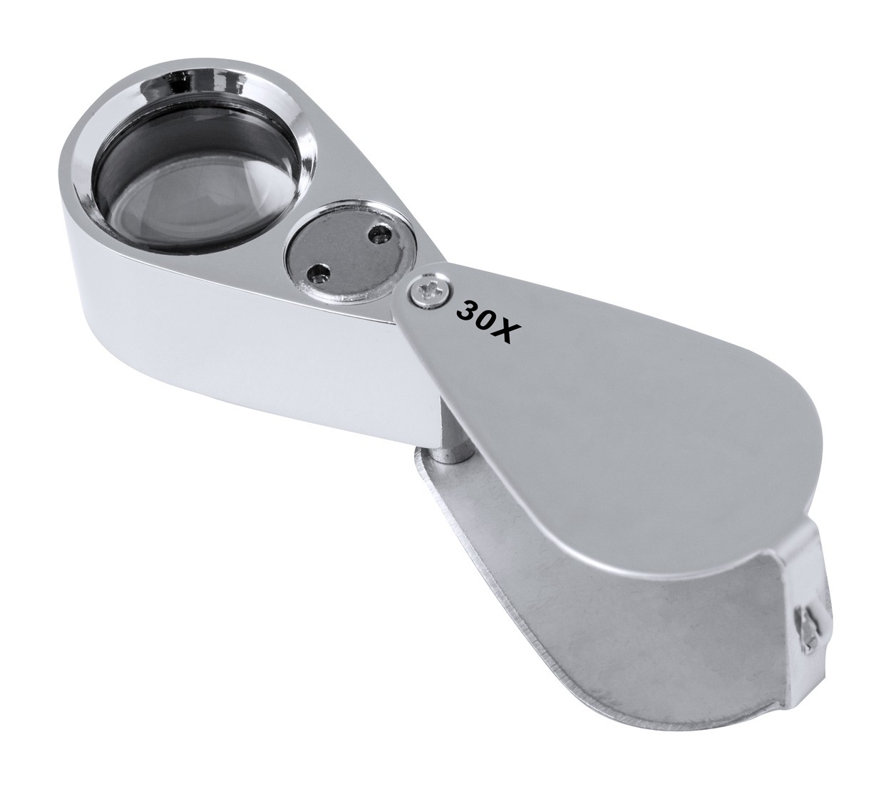 Foldable magnifier in ABS plastic and metal, with 2 LEDs. Including button cell batteries.